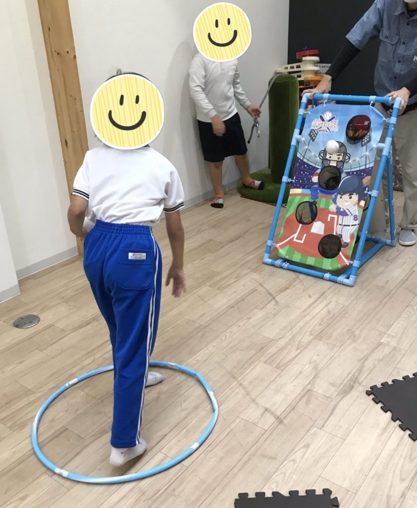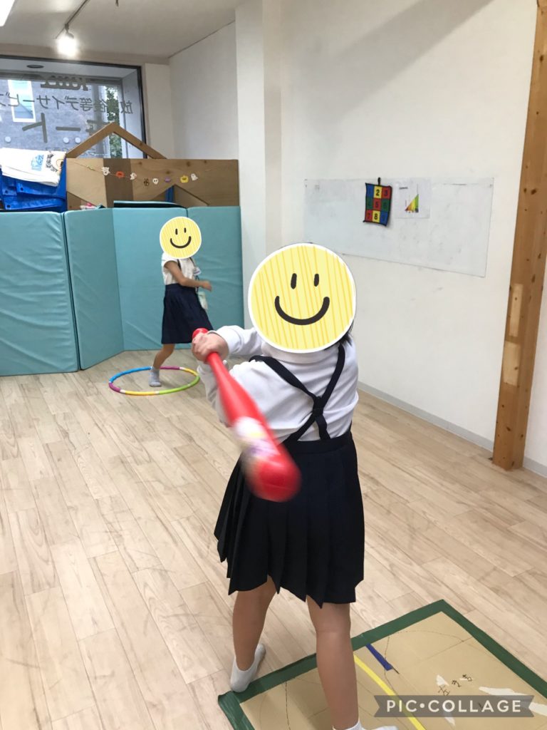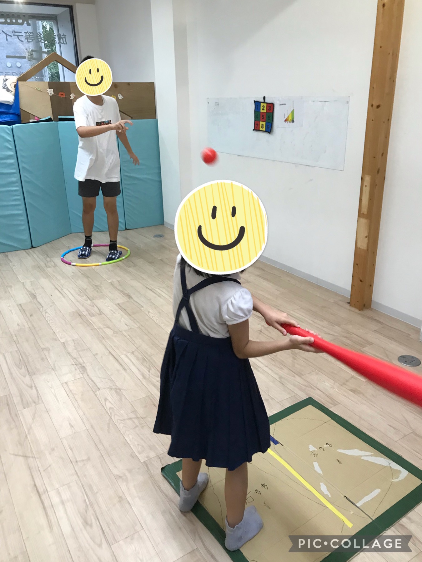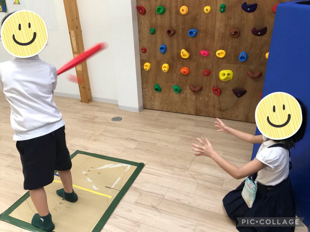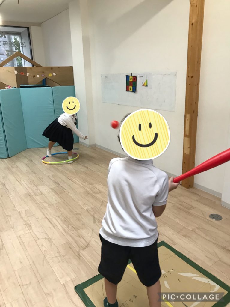 みんなで野球大会をしました!的当てマットに向かって投げるコーナー、実践形式で野球をするコーナーに分かれて体を動かしました!実践形式では、ピッチャー、バッター、キャッチー、審判と役割を相談しながら順番に楽しみました!「審判やってみたい!」と積極的に審判にも挑戦しています!ピッチャーでは、張り切って投げてしまうこともあったので、相手が打てるスピードを意識しながら力加減を調整しました!バッターでは道具を使った距離感を確認をする為に、素振りをしたり、ゆっくりとボールを打ってバットの距離感をイメージしています!ピッチャーの投げたボールにしっかりとタイミングを合わせて前に飛ばすことができていました!的当てマットでは、的の高さが違う4つの的にめがけて投げています!1人3球、順番に楽しく何度も投げて、投げるタイミングやフォームを調整しました!