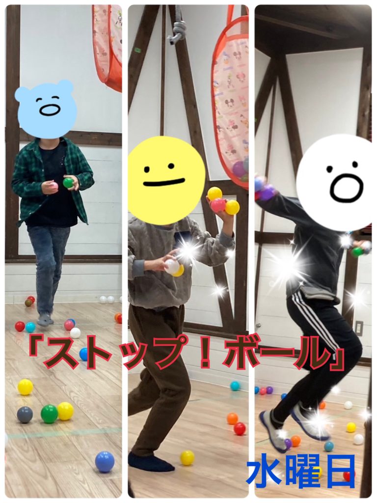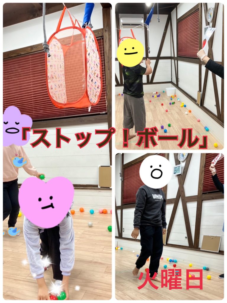 最初は活動の最中の指示に慣れていないこどもが多く、指示と違う事をしてしまう事がありましたが、回数を重ねると、カラーボールを入れている最中でも指示を気にすることが出来るこどもが増え、「とま」と職員が言うと止まって、次が「れ」だと静止し、「と」だと動く事が出来ていました😄✨