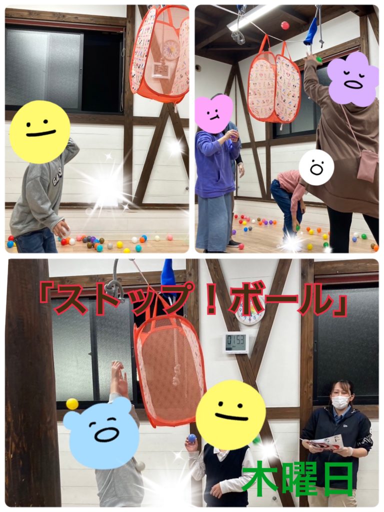 「ストップ!ボール入れ」は制限時間1・2分間の間に、中央にぶら下がっているカゴにカラーボールを入れるが、途中、職員が「止まれ⛔️」の指示のカードを出している間は、カラーボールを入れるのを止めるルールでした。