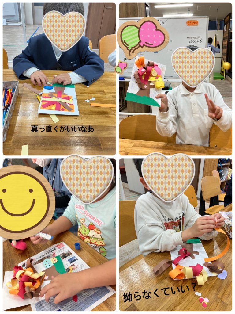 指先を動かしくるくる捻ることでビジョントレーニングにもなります👀職員が提案していても「くるくるしなーい」「真っ直ぐがいい」「くるくるやなくて丸くてもいい?」と言われたので「思うように作ったらいいよ」と本児の思う通りにやってもらいました。見本を真似する児童、思い思いに作る児童様々ですが、型に嵌めない支援も必要な時がありますね😅