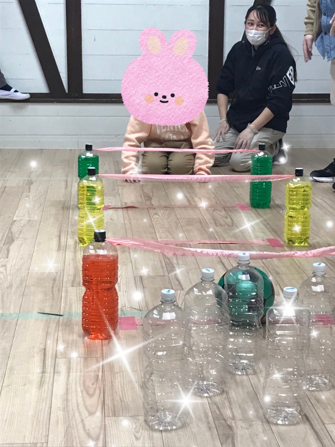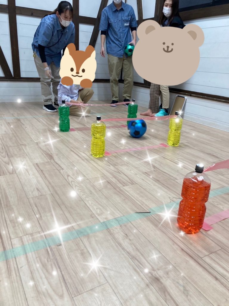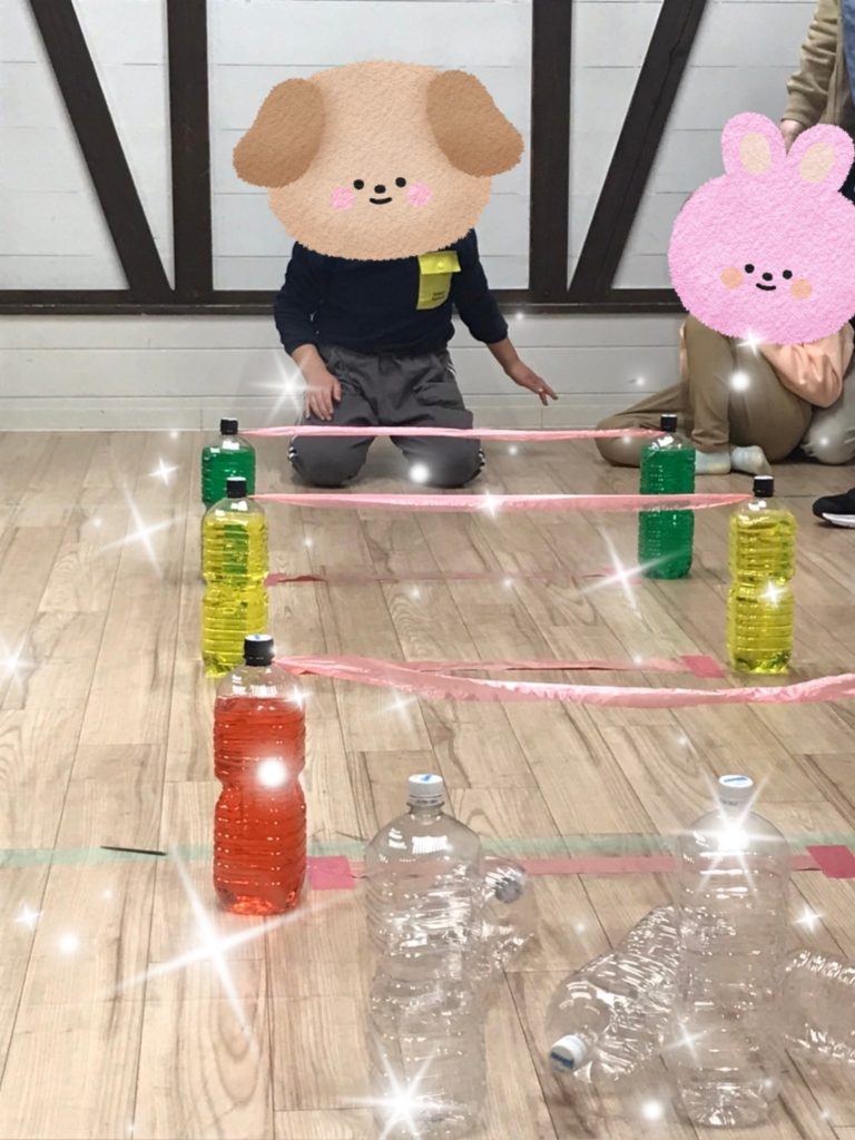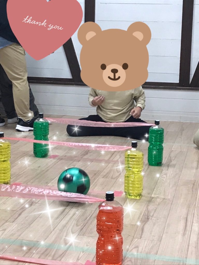 ビニールボールを1球ずつ転がし、粘着力のあるテープにくっつかないようにトンネルを潜り、ゴール先にあるペットボトルのピンに向かって勢いよく転がしていきました🎳💨