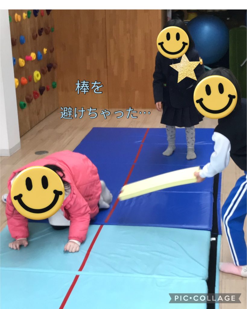 動く棒を見ることで「ビジョントレーニング(動体視力、空間認知、距離感)」に繋がり、跳ぶタイミングを見定めることで、「リズム感」「判断力」に繋がり、跳び方や跳ぶ高さ、避け方を決めることで「思考力」「ボディーイメージ」「筋力」「バランス」に繋がるなど、様々な効果が期待できます。屈んだ後に跳ばないといけないときには直ぐに姿勢を変えないといけないため「瞬発力」も鍛えられます。後ろに行った棒が後ろから来るのでクルッと向きを変えて構える必要があるため「前庭覚」も鍛えられます。