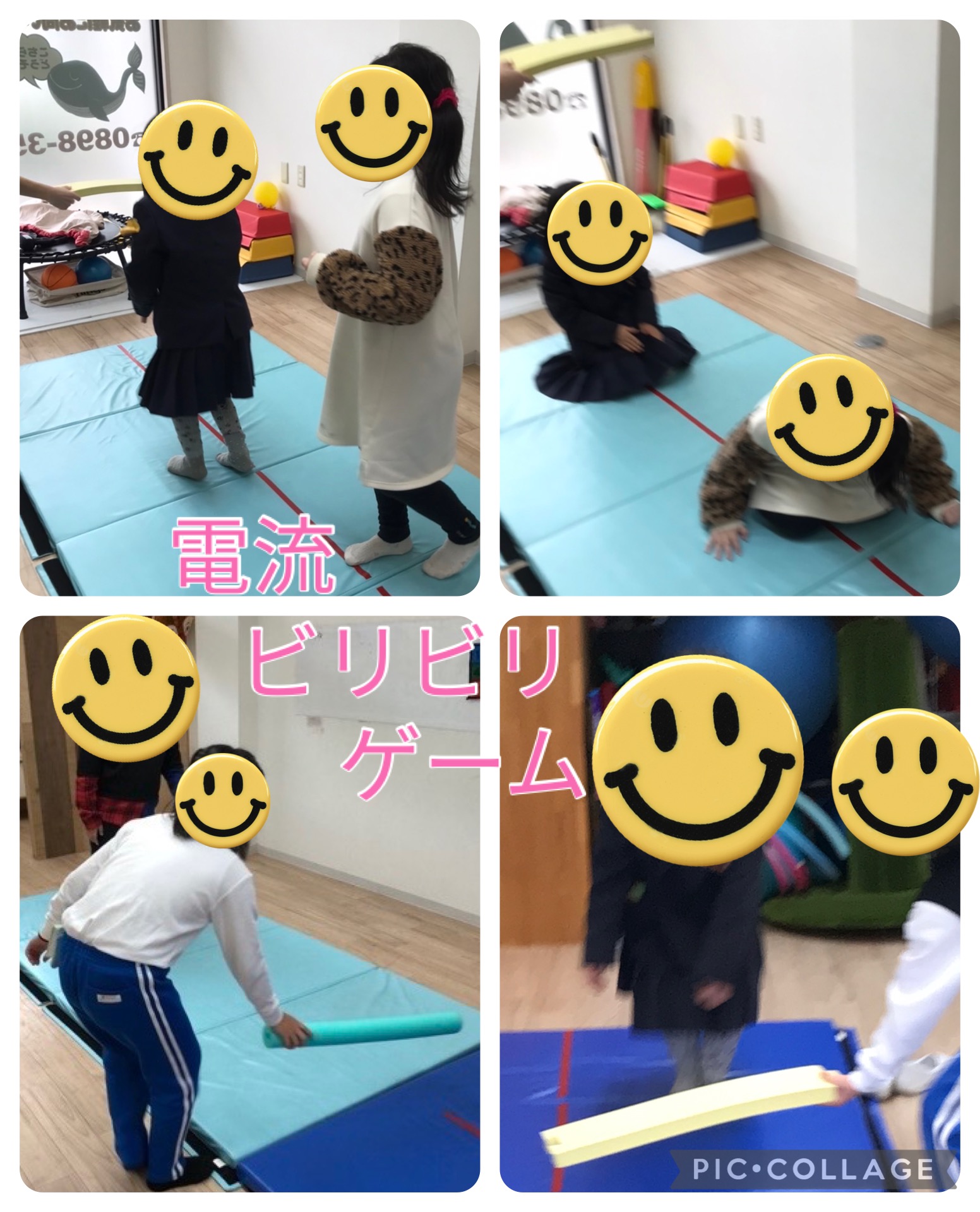 棒を動かす人は往復が大変ですが、往復のタイミングを早めることで、避ける人はバランスを崩しやすいので、ビリビリチャンス😁避ける人も急いで体勢戻さなきゃ!となるので瞬発力を鍛えるチャンス。「やられた」「やられてたまるか、逃げ切った!」となるのでお互い悔しさもありますが、笑顔になること間違いなし!