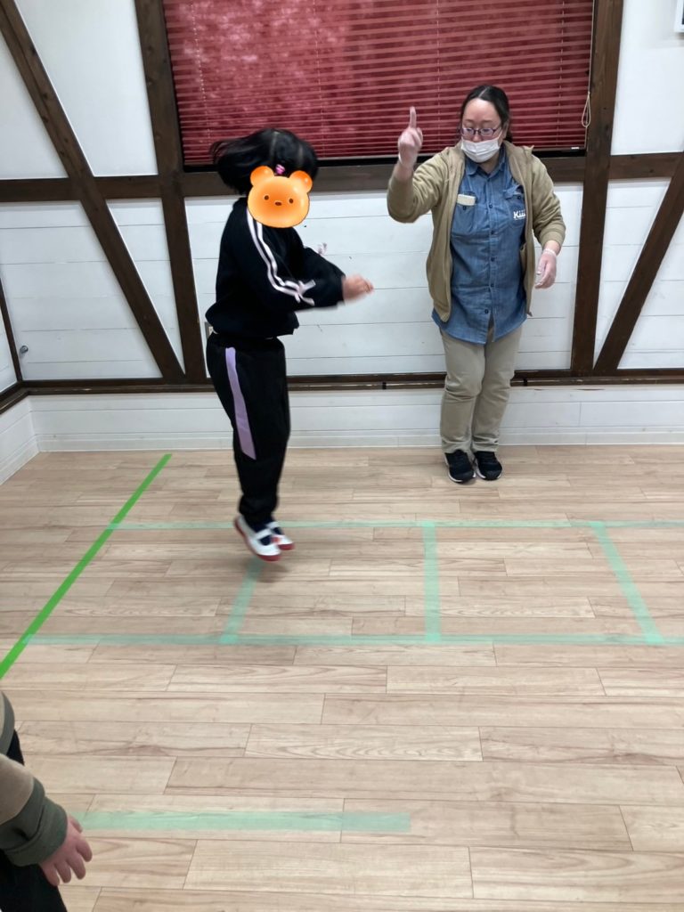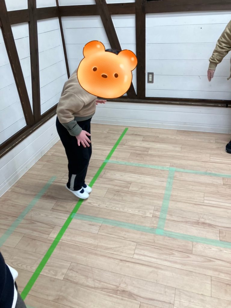 後半は、真ん中に線を引いて足を開いたまま前にジャンプ(火・木)