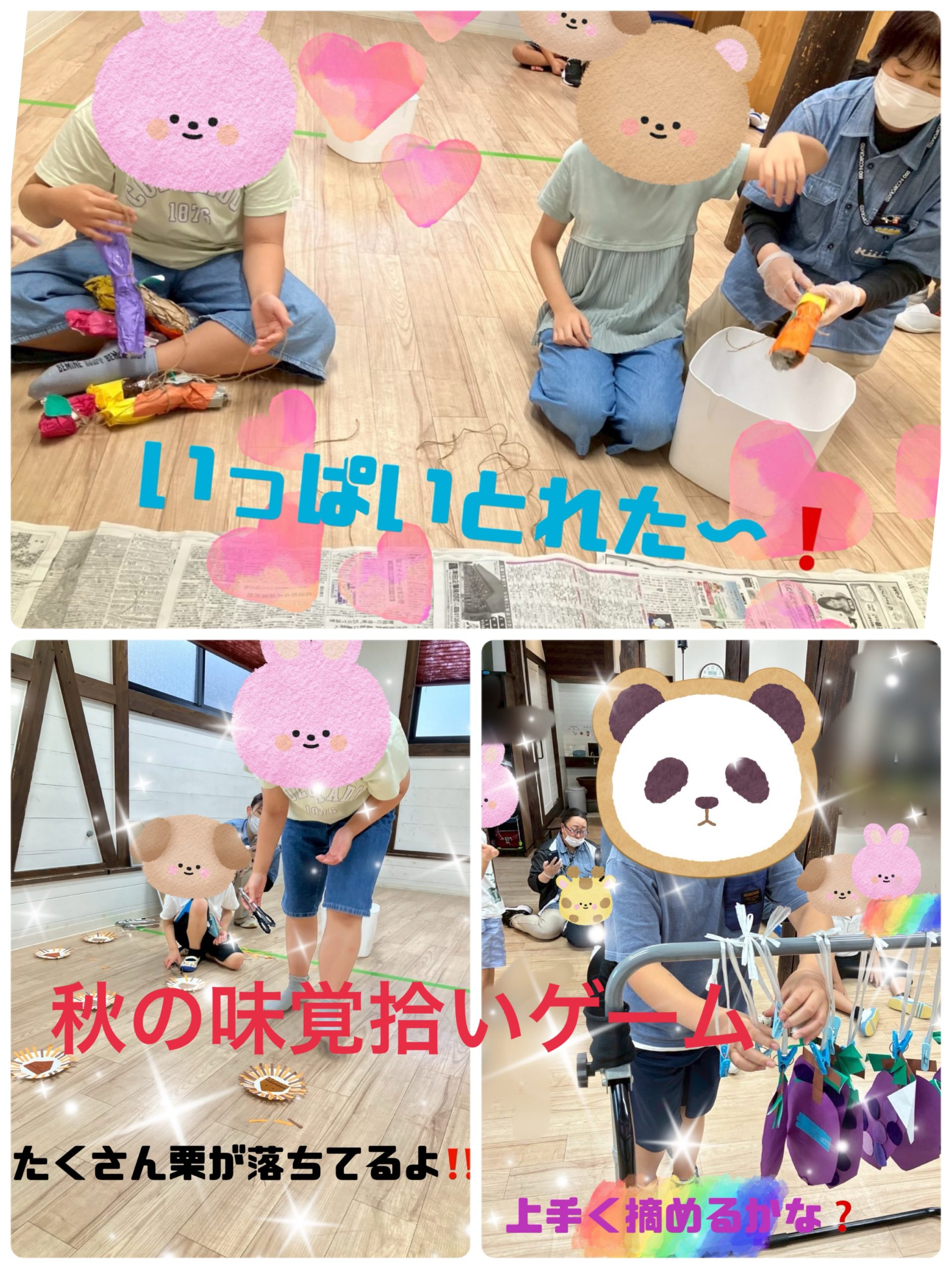 前週、こども達と一緒に秋の味覚(さつまいも、栗、ぶどう)の工作しました!今週はそれらを使った『味覚拾いゲーム』をしました!
