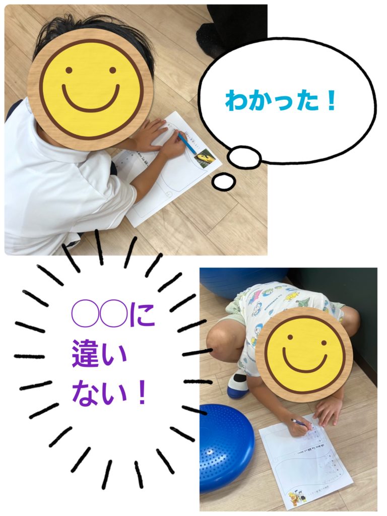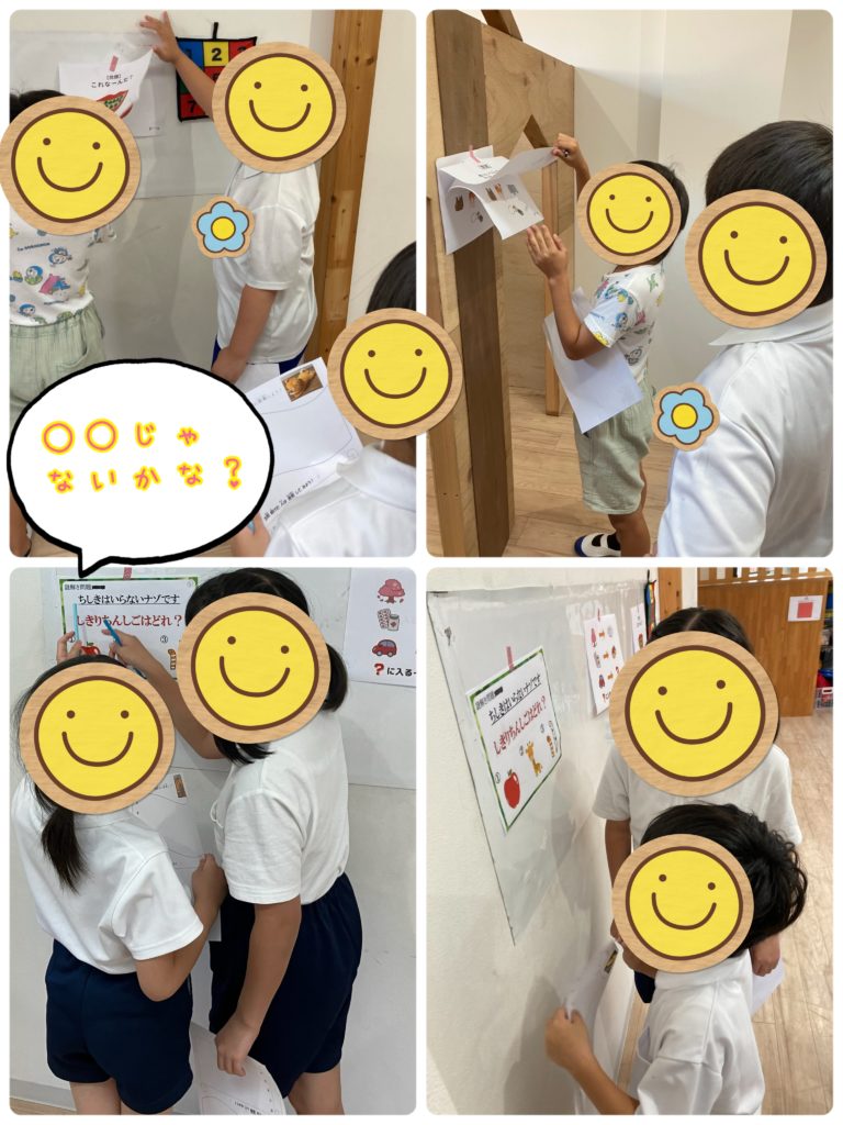 答えがわかるとつい「わかった!〇〇だ!」と言いたくなるところですが、みんなルールを守ってチームのお友達に小声で伝えてくれていました✨