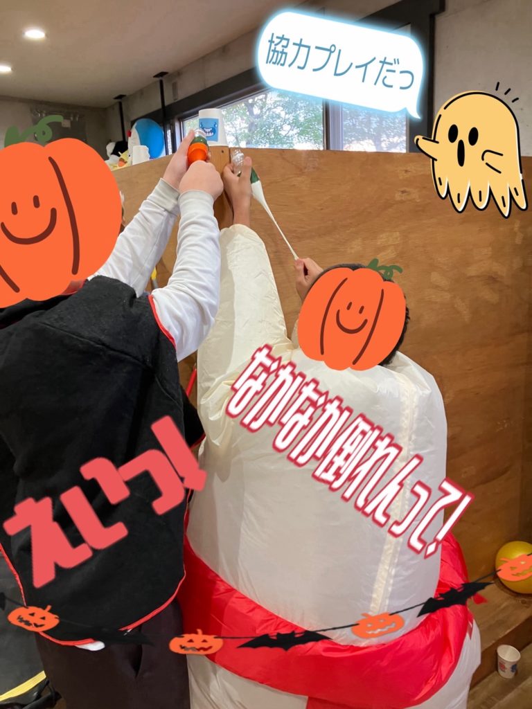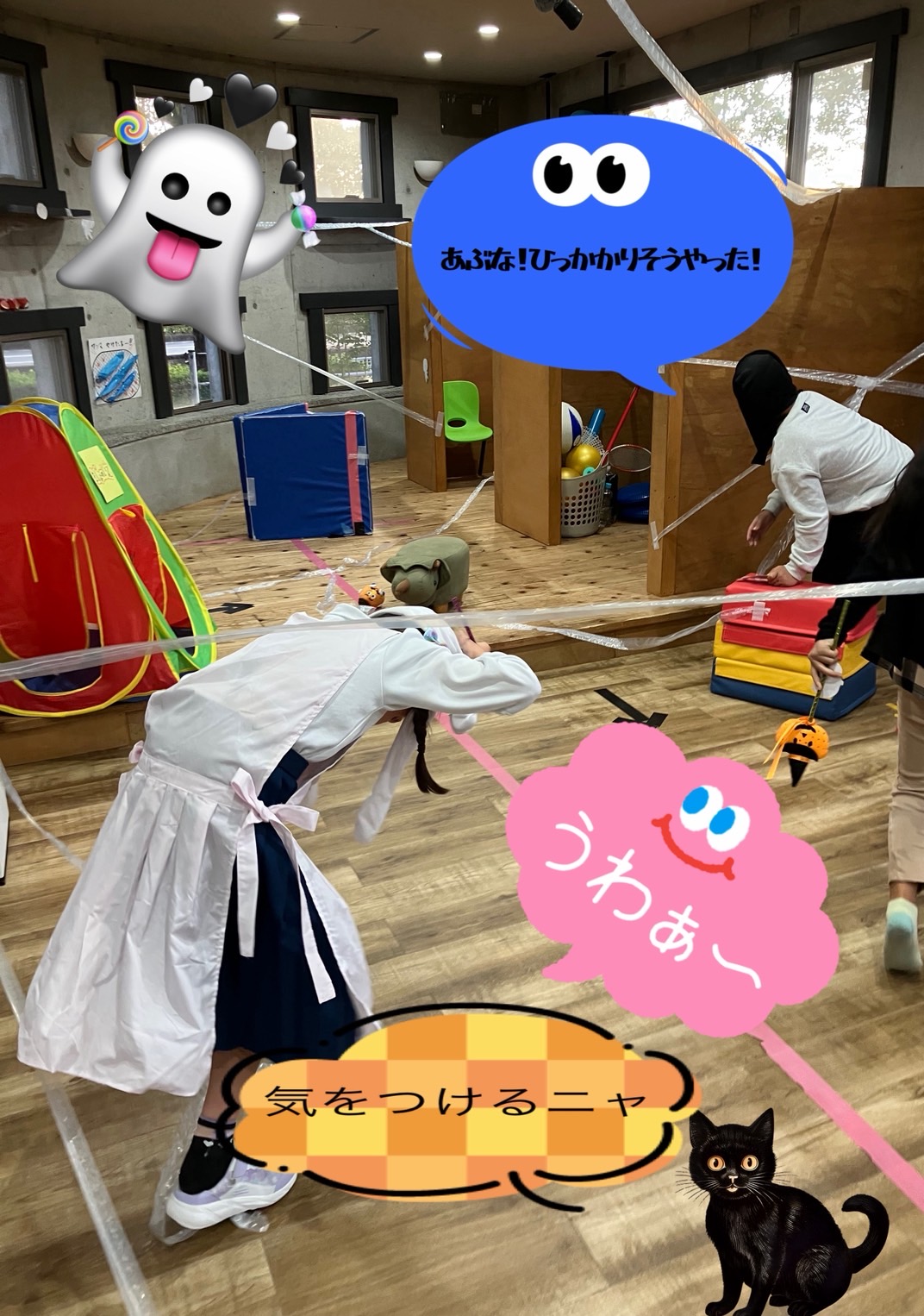 【31日】運動室いっぱいに張られたクモの糸に自分たちの顔写真が貼り付けられたミイラ、オバケ、カボチャを救出‼️