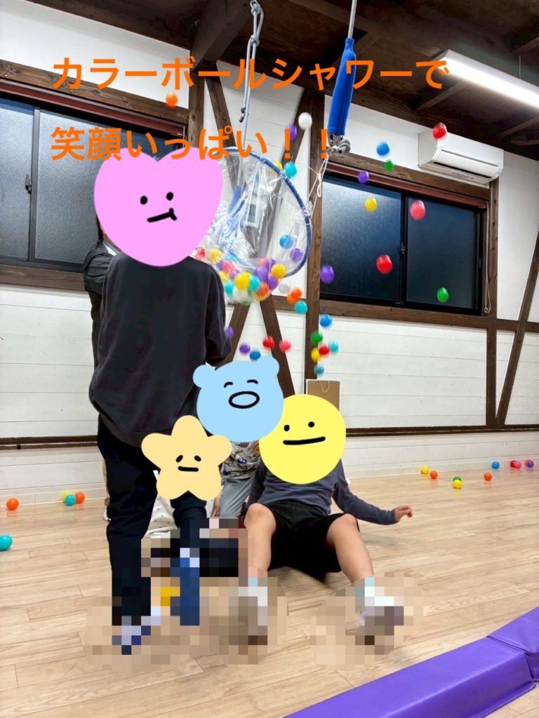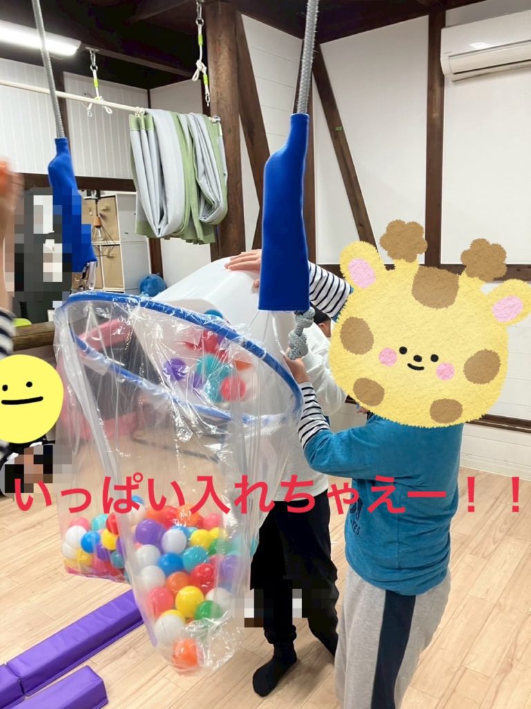 お友達と協力して、たくさんのカラーボールを袋に入れていました😊