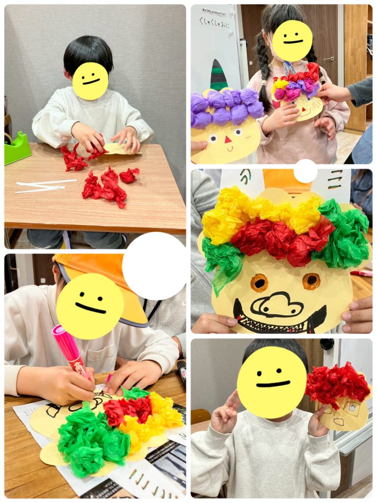 2月の1週目は「節分ウィーク」として、豆カップ作り・節分クイズ&豆まき・くしゃくしゃおに・鬼のスクイーズ作りを行いました。
