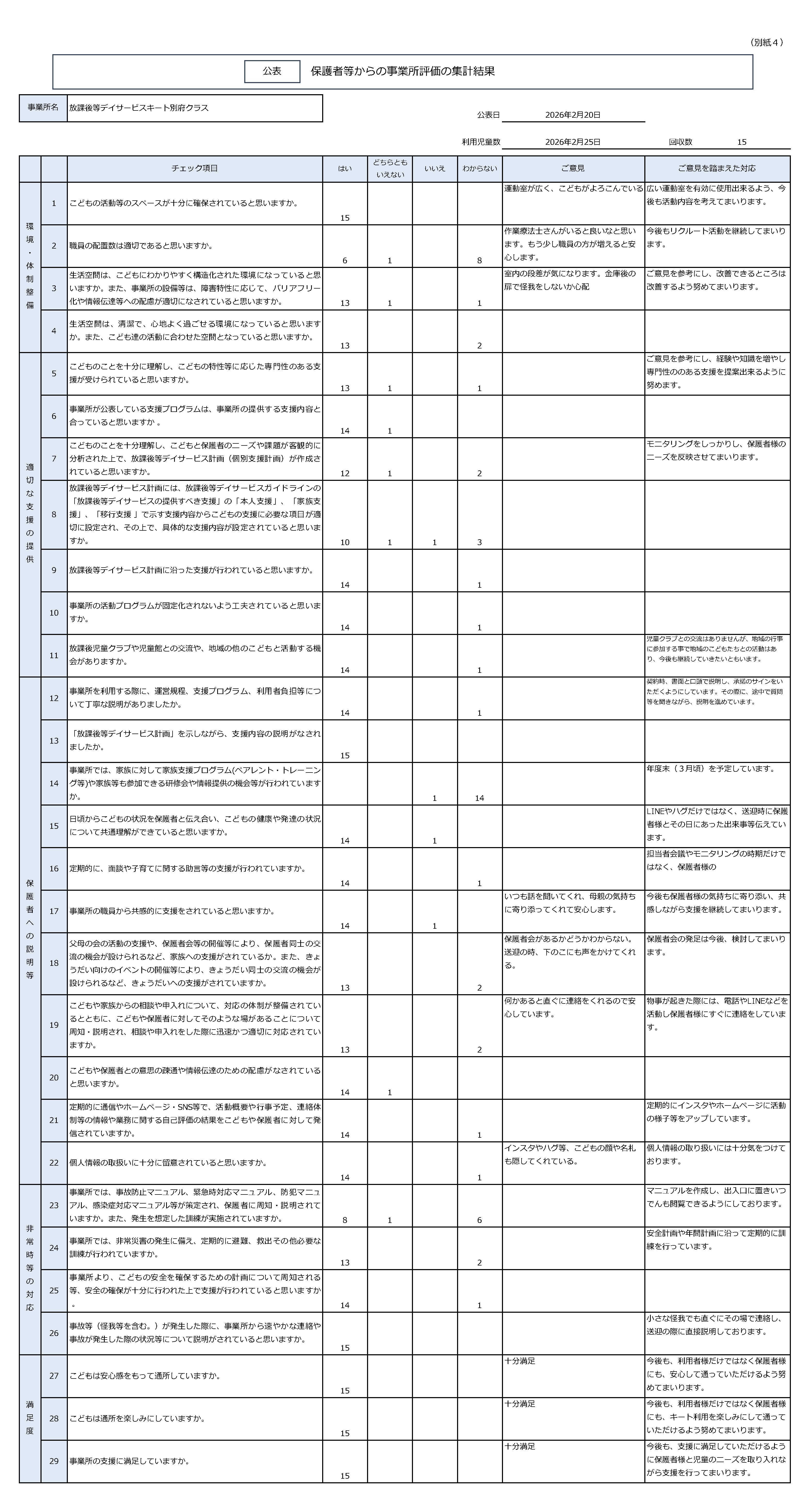 2026年 松山別府クラス 児童発達支援・放課後等デイサービス自己評価表【保護者用】 お知らせ 2026.02.20 2026年松山別府クラス_児童発達支援・放課後等デイサービス自己評価表【保護者用】.pdf