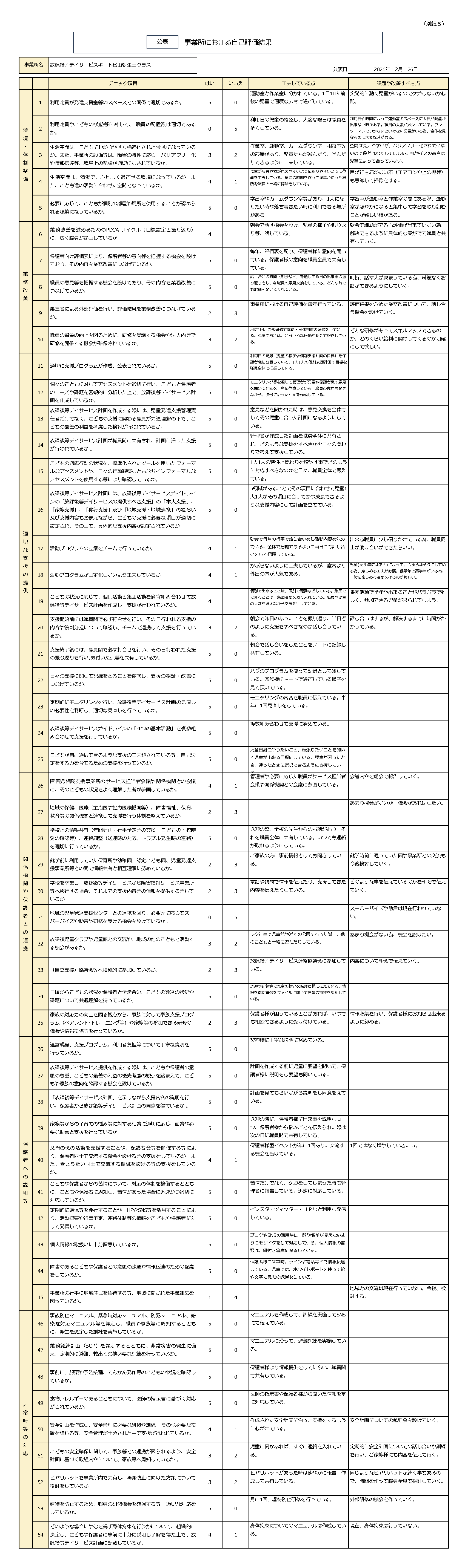 2026年 朝生田クラス 児童発達支援・放課後等デイサービス自己評価表【事業者用】 お知らせ 2026.02.27 2026年朝生田クラス_児童発達支援・放課後等デイサービス自己評価表【事業者用】.pdf