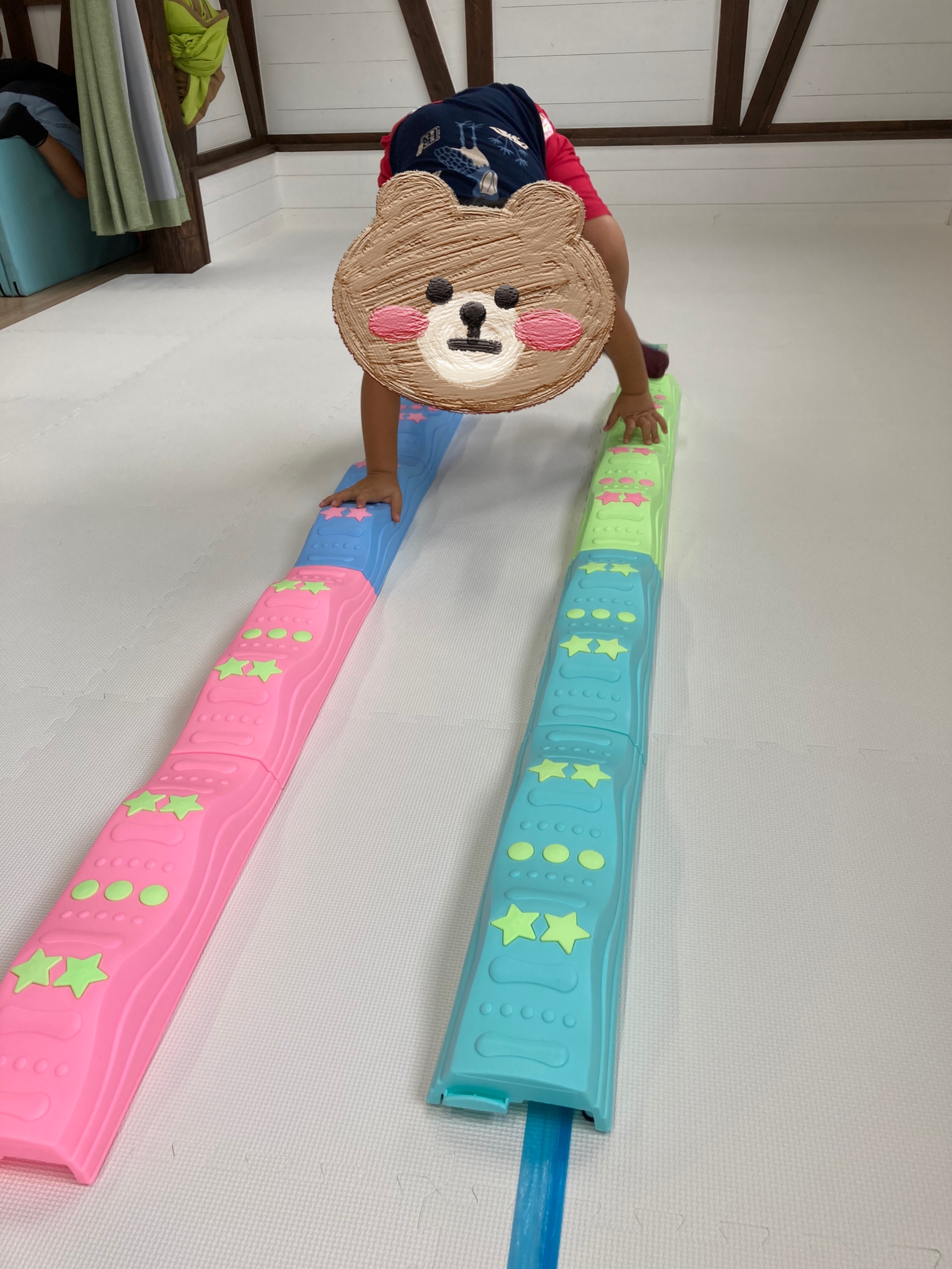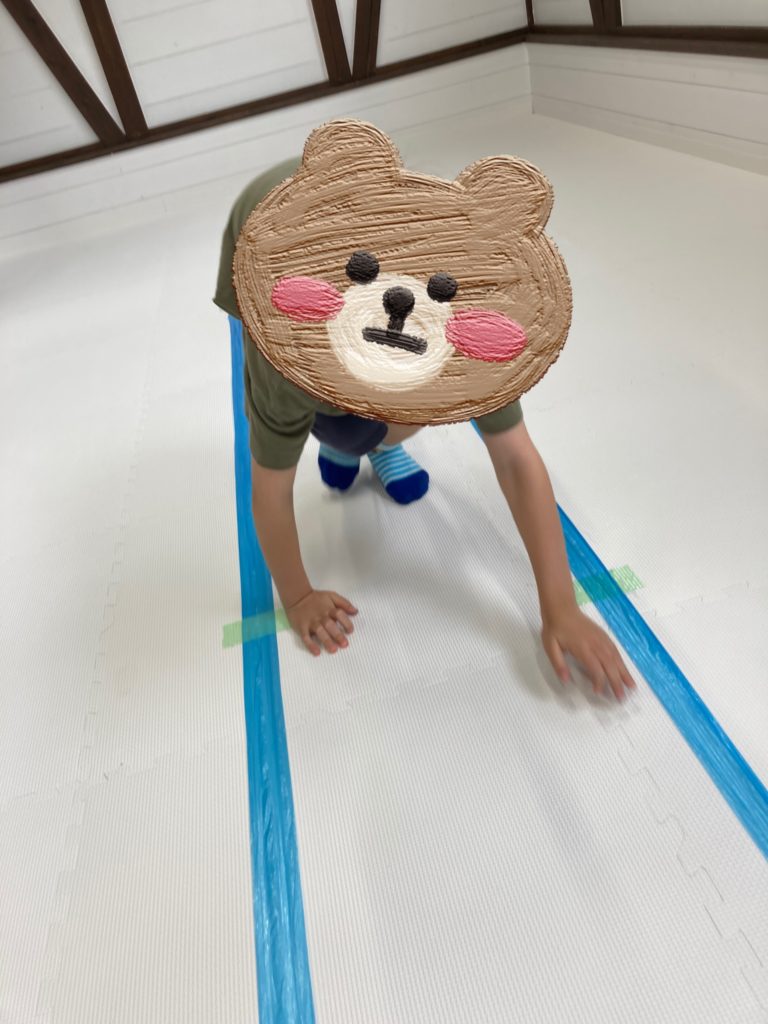 児童に合わせて難易度を変えていき、ビニールテープの上を渡る事が出来たら、ステップアップし平均台の上で動物歩きをします✨