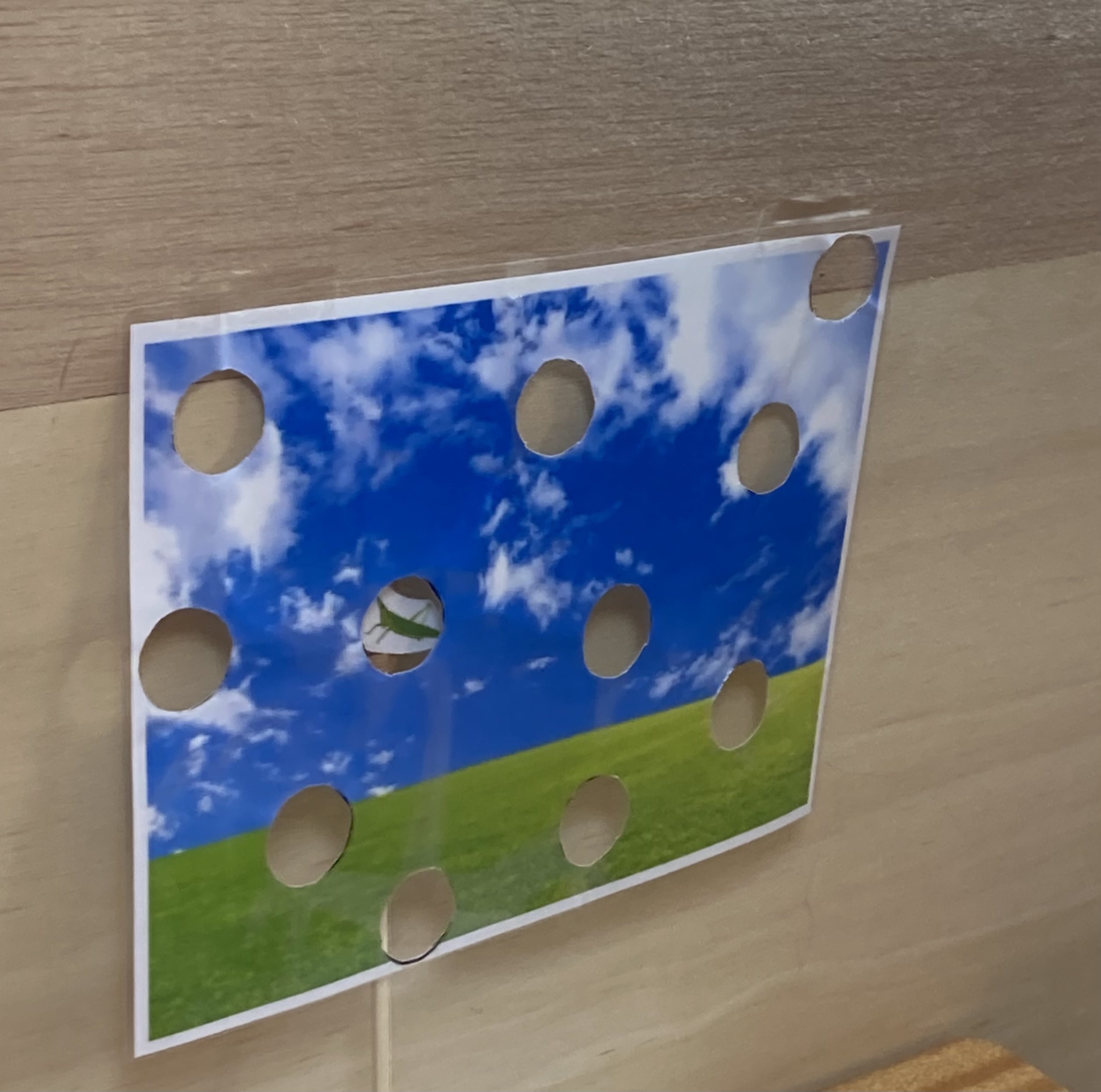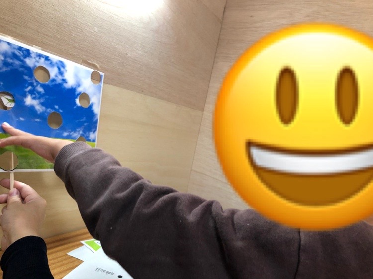 丸い穴があいた紙を用意して、どこの穴にイラストの虫があらわれるか、大きな目で探してもらいました。