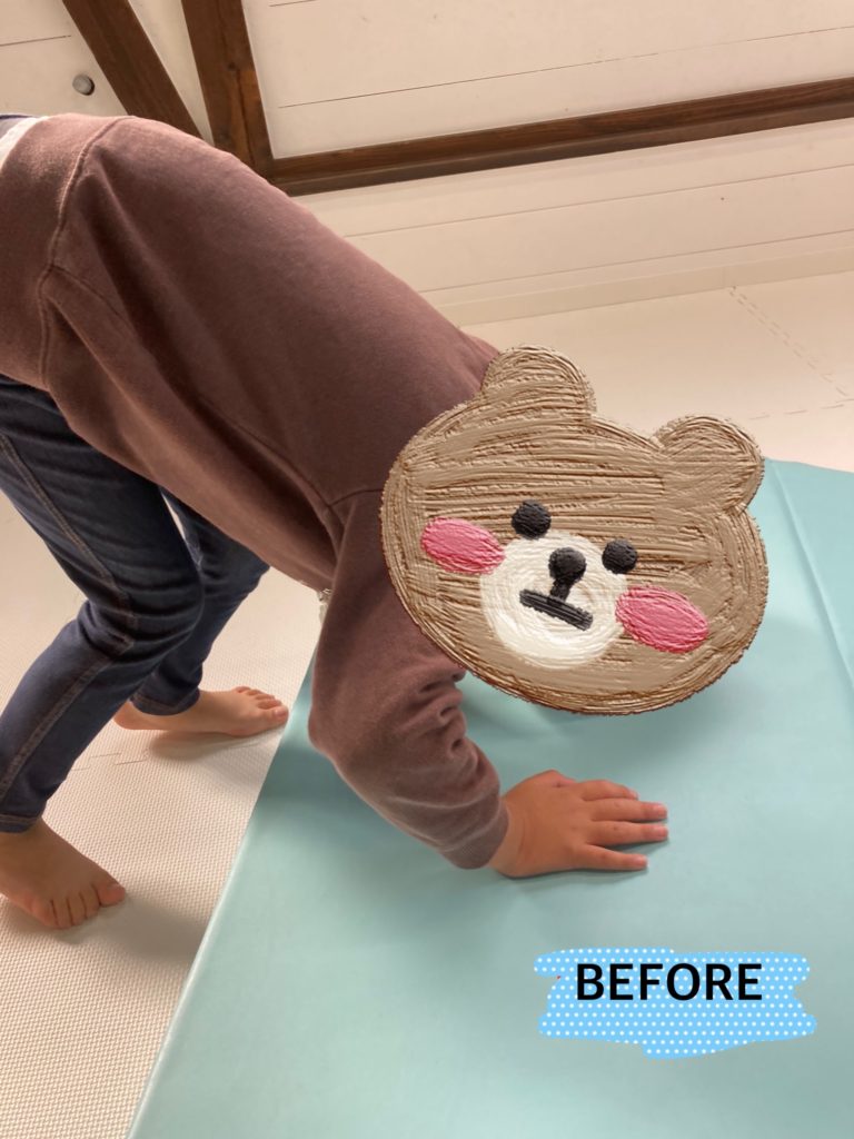 最初はマットに頭をつけるまででしたが、職員が前転が出来やすくなるようマットを二つ折りにし工夫しました☺️