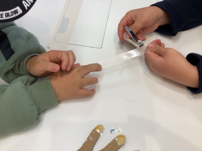 まずは爪切りの道具に慣れてもらい、無理なく楽しみながら練習してもらおうと思います。「先生、どこ握るん?」と爪切りの力が入る場所を工夫しながら切ってくれていました。今日の手の模型は大きかったので、もう少し小さいもので再挑戦してみようと思います。まずはクリアファイルを爪代わりに練習すると言ってくれました。