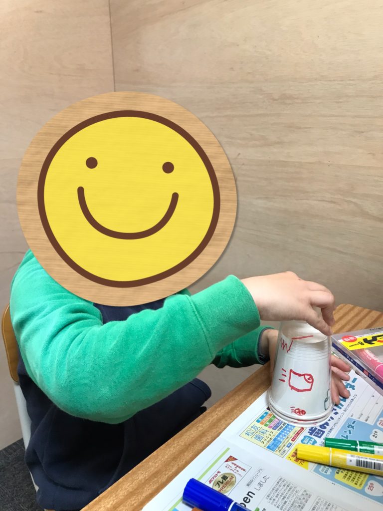 紙コップには「先生、キャラクター見せて!」と、キャラクターの特徴をしっかりととらえて書いていきました😆