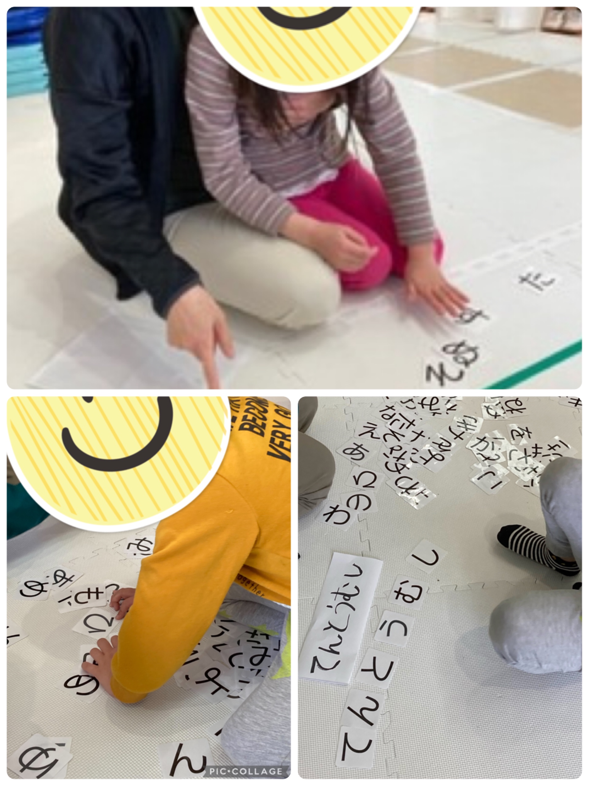 運動室でひらがなカード並べ遊びをしています。お題を見てから児童がたくさんあるひらがなカードの中から文字を探され「てんとうむし」「きりん」と発音されながらお題通りの言葉に並べてくれています。また、自分の名前も並べて発音されています。
