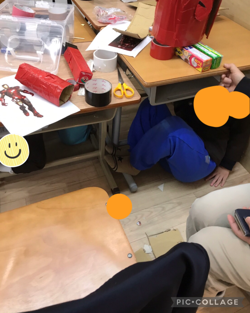 みんな楽しく遊んでいた活動を中断して、直ぐに机の下に隠れて、先生が「出てきていいよ」と言うまでじっと机の下で待ってくれていました✨