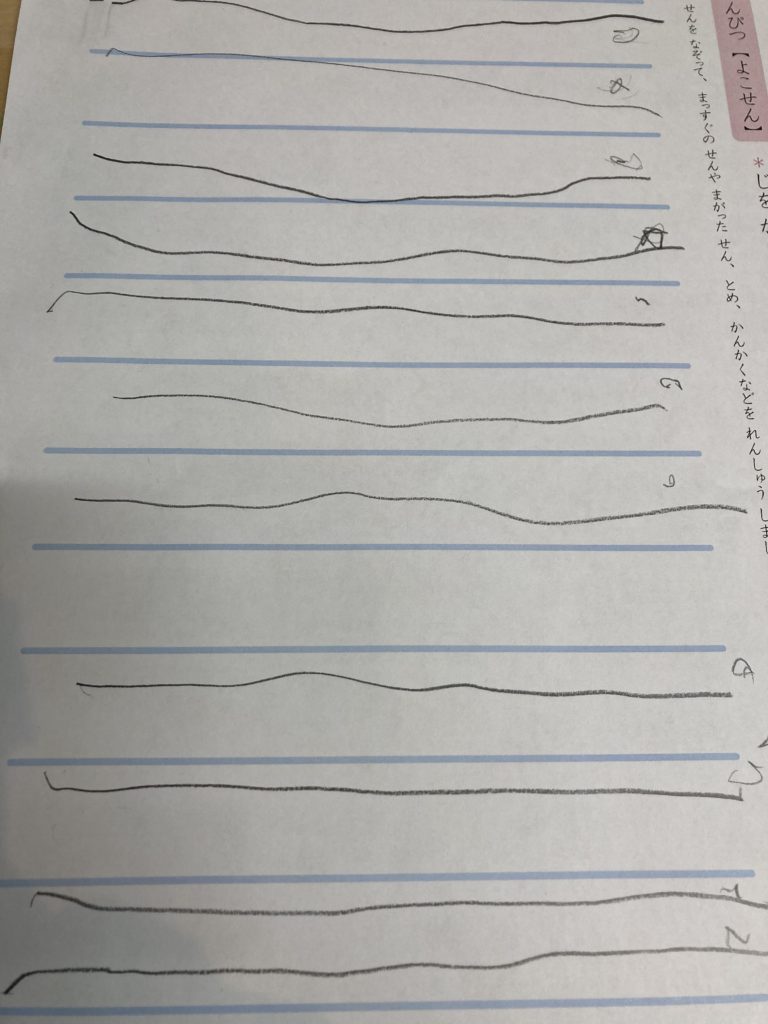 【松山南クラス】本日のできごと字を書く前の準備運動で、運筆(横線)をしました。