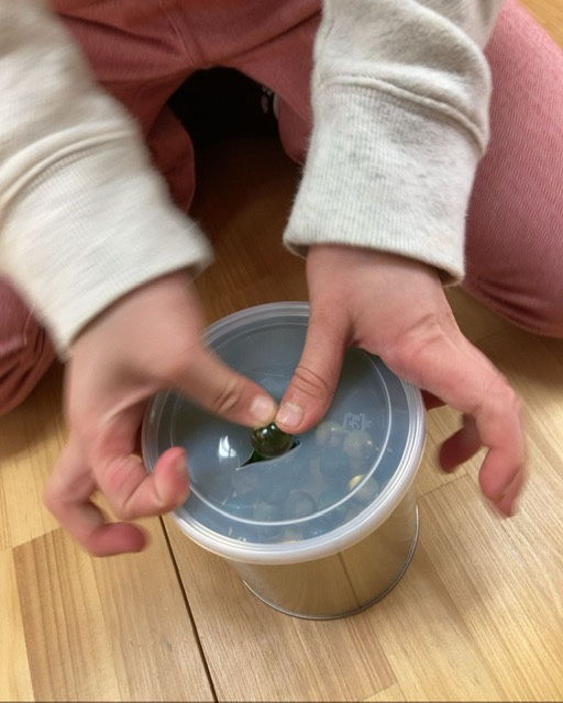 手や指の操作や、目と手の協応をアップできそうです。キラキラしたビー玉🔮ですが、つるつるしているので、指先の力が要ります。また、触れた感じもひんやりとして気持ち良いかもしれません。