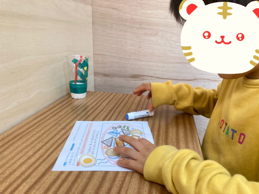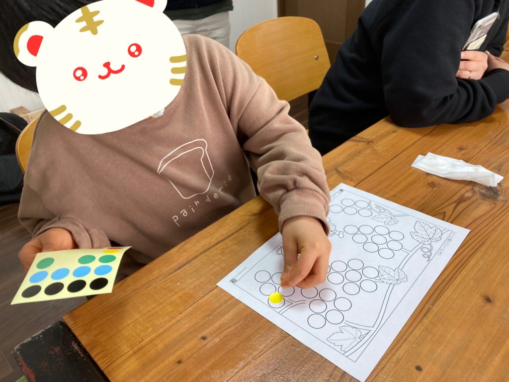 学習の時間に、シールなどで貼り絵をしてもらっている児童がいます。