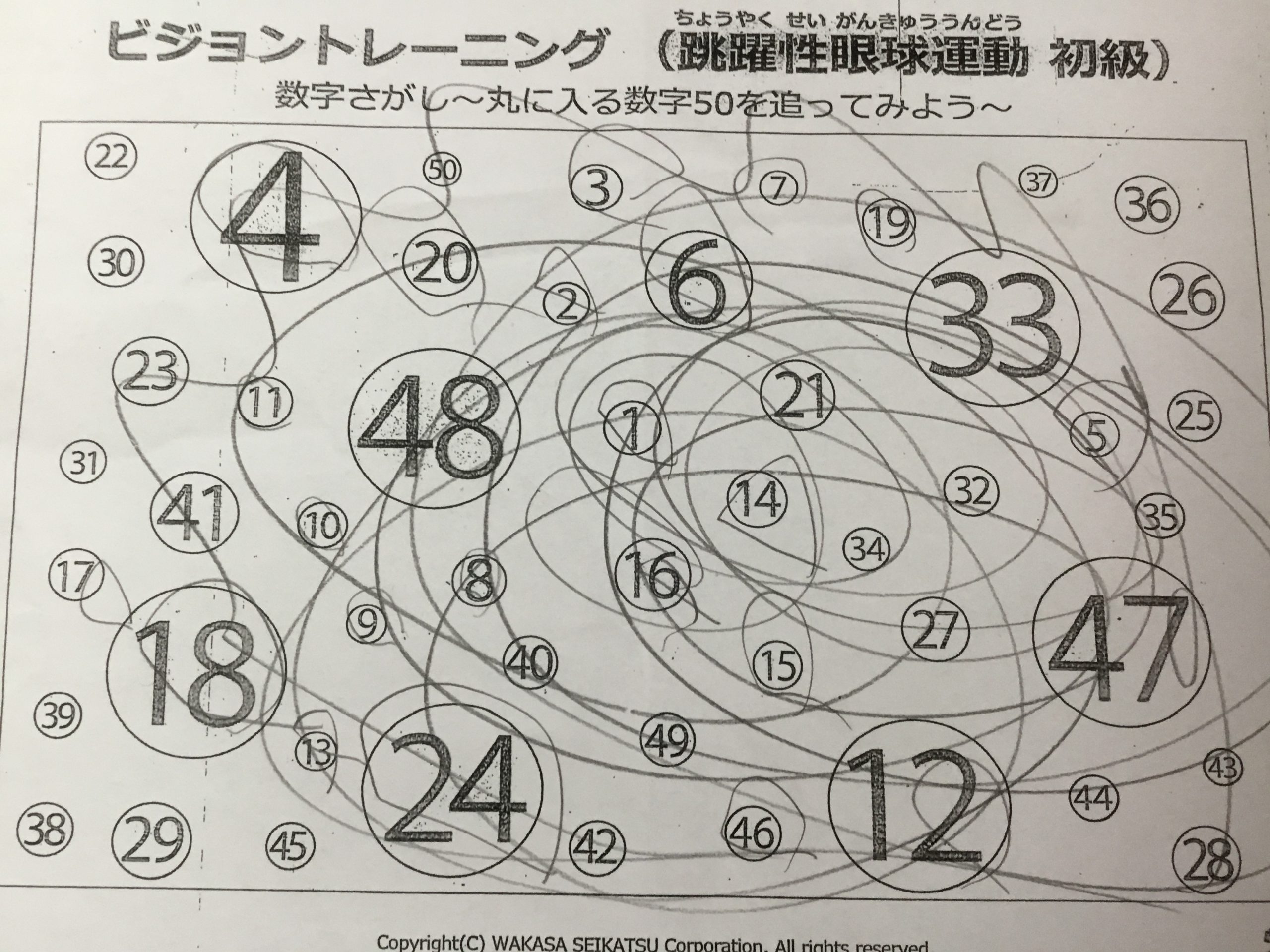 キートでは療育の一番最初にビジョントレーニングを行います。その一環で冒頭の画像で表したプリントを使います。初め見ると数字が並んでいるだけで拒否をすることがあります。
