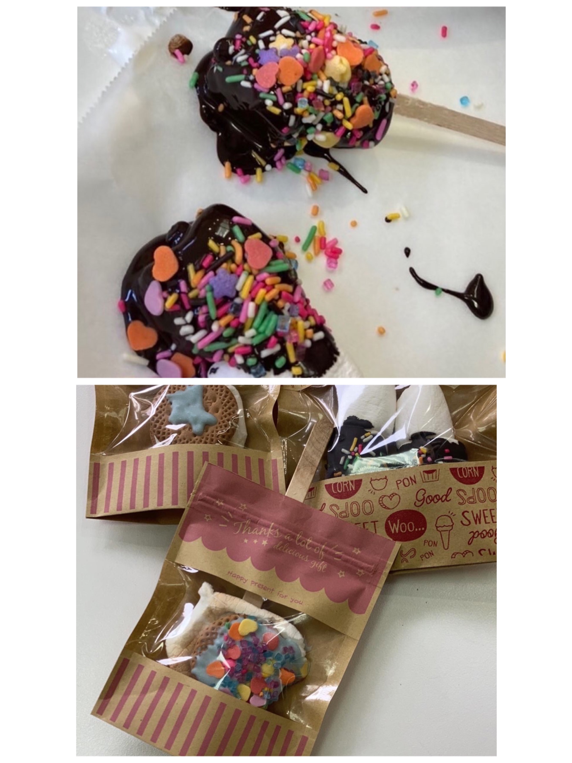 「焼きマシュマロサンド」「デコレーションマシュマロ」を作りました。マシュマロを棒に刺してもらい、職員が事前に湯煎したチョコにマシュマロをつけたてから、好きなトッピングをしてもらいました。