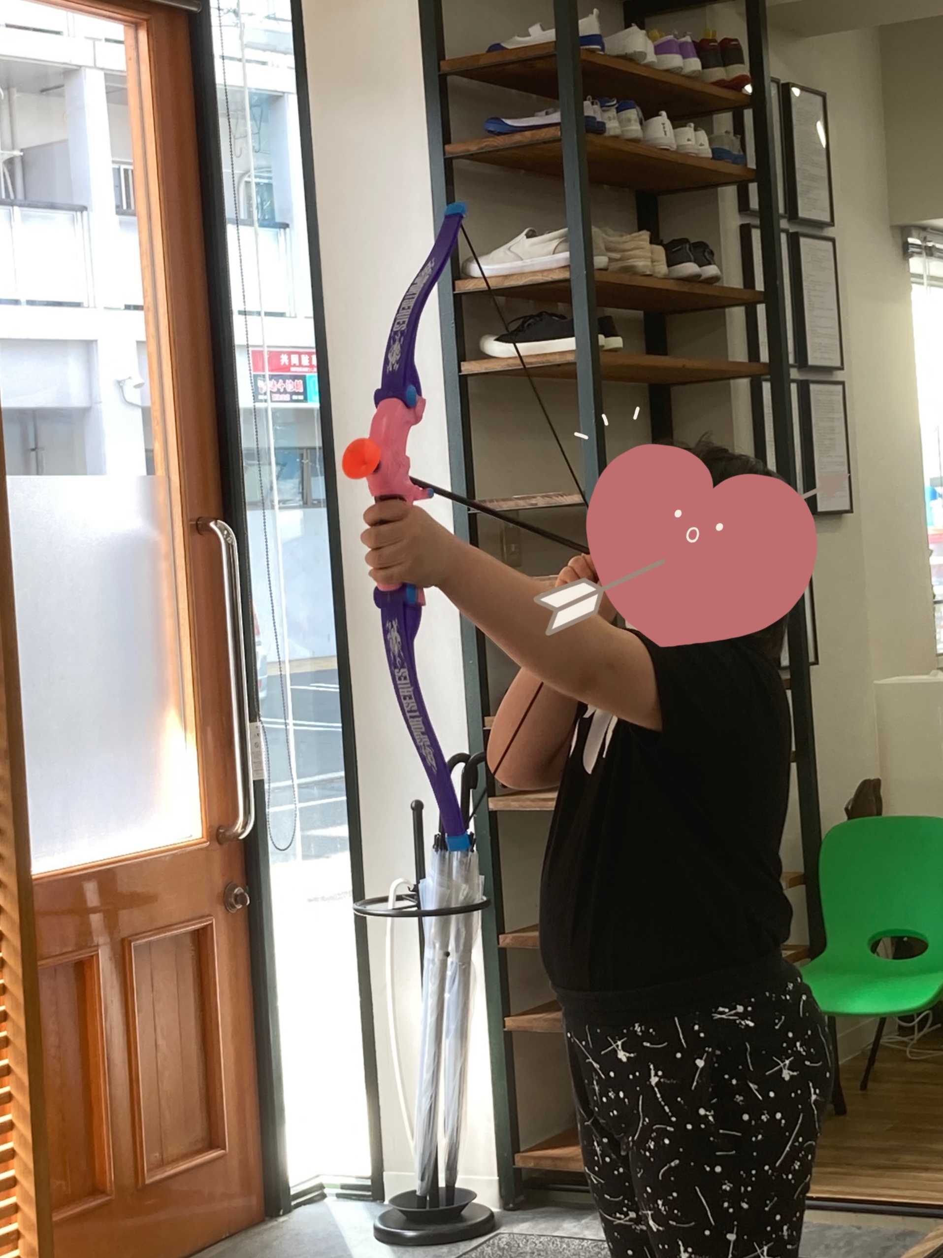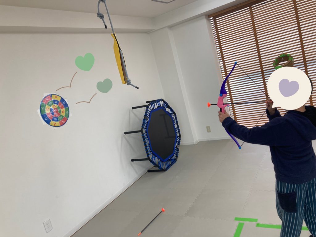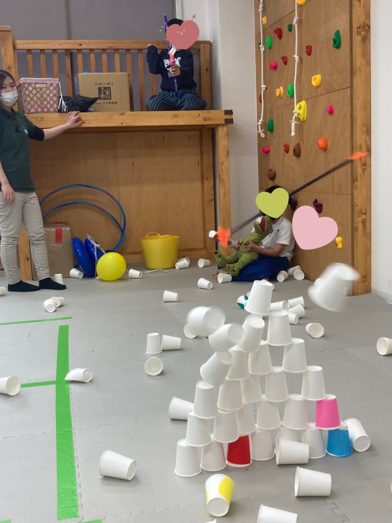 使い方には気をつけて貰えるように的を作ってみたり、紙コップタワーを作って矢を当てて崩してもらったり…