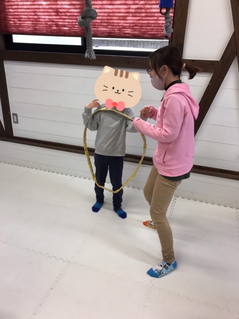 手を使わずに体を動かし、フラフープを渡せるか⁉️というゲームです。
