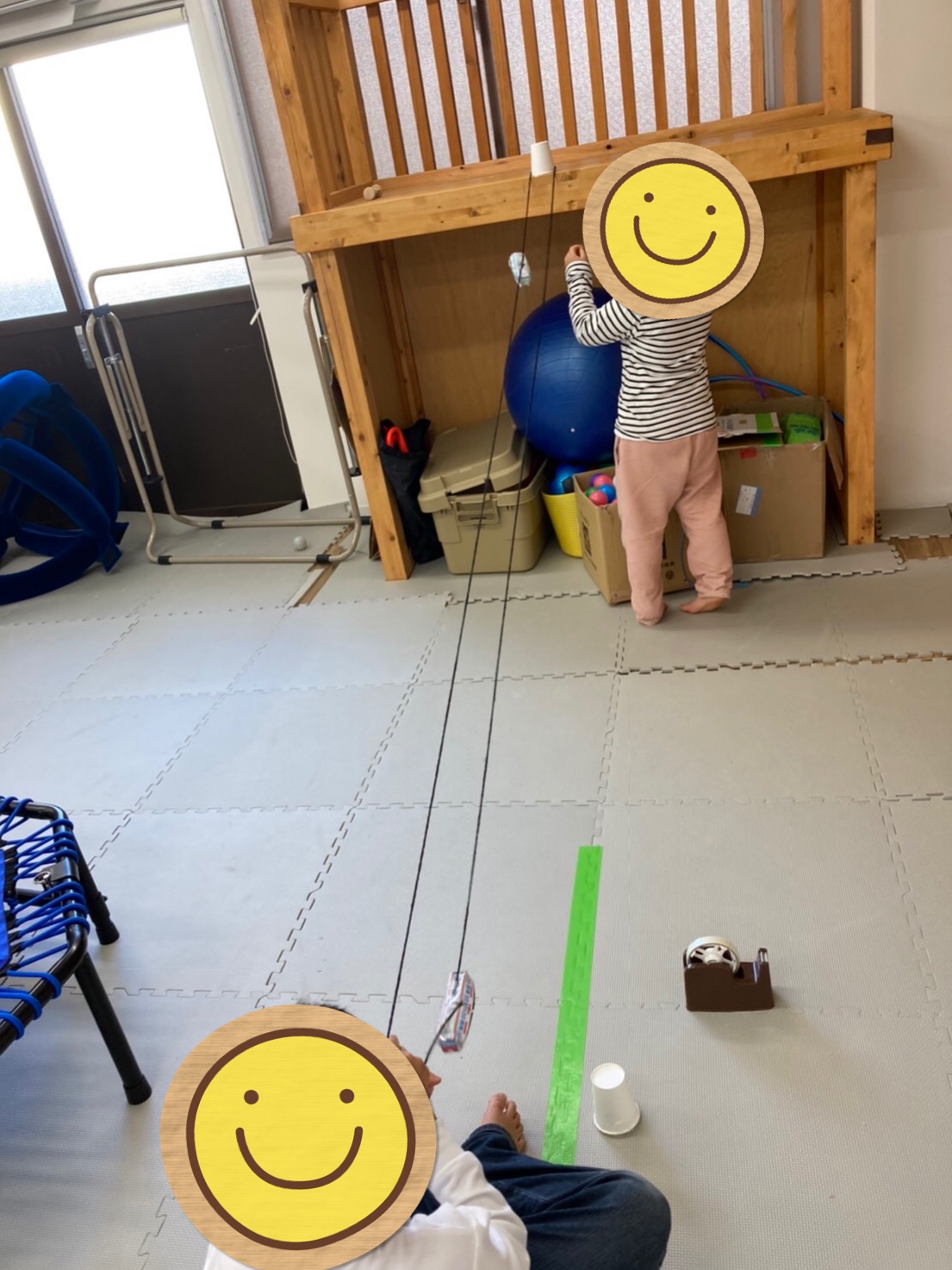 電車のペーパークラフトに毛糸を取り付けて、毛糸を動かすために、ロフトと床に紙コップをくっつけて高低差のある軸を作って…