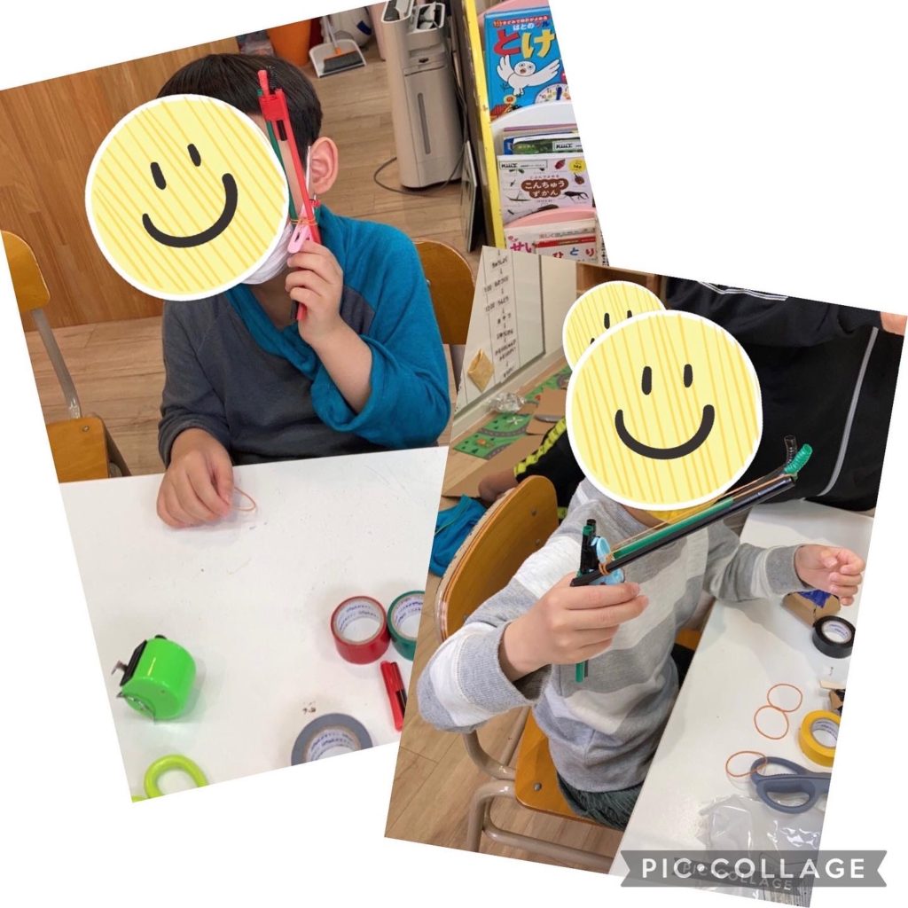 今日はストローと洗濯バサミで作れる“輪ゴム鉄砲”を作りました。作り方の動画をみんなで見て、職員の説明も聞いて作りすすめました。