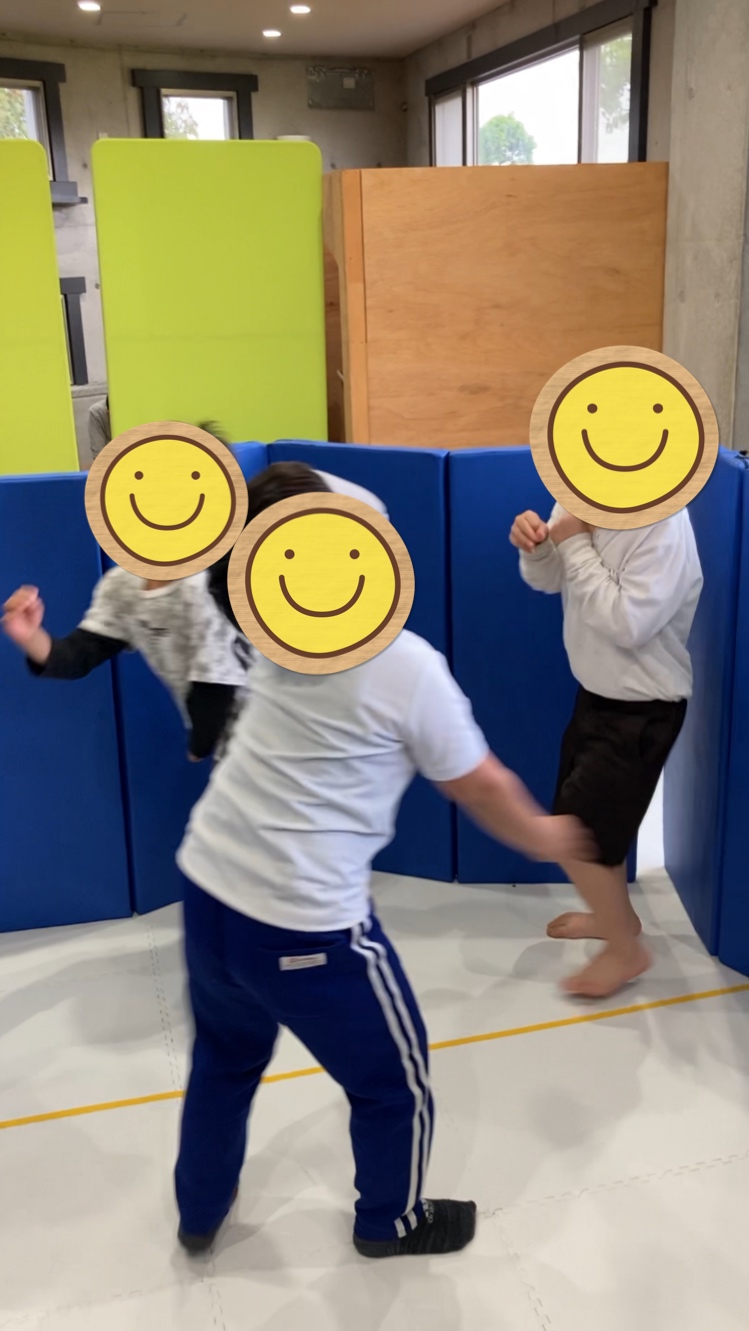 この遊びの目的としては目を隠していることで自分の体の位置(ボディーイメージ)やタッチする時の力加減などに関与する固有感覚や児童が歩いたり喋ったりする声などの音を頼りにしたり、どのように動くか、どの程度の距離動かせばいいかなどの運動企画のトレーニングにもなります!