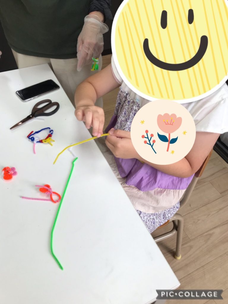 モールを使って指輪の作品作りをしました!長さや色の組み合わせ、どのように繋げていくかを試しながら挑戦しています。最初は緩く繋げてしまって上手く繋げなかったり、外れてしまうこともありましたが、コツをつかむと指先にしっかりと力を入れ、強く回したり、絡ませたりしながらしっかりと固定できていました!作品が出来上がると「できたよ!」と見せてくれました!