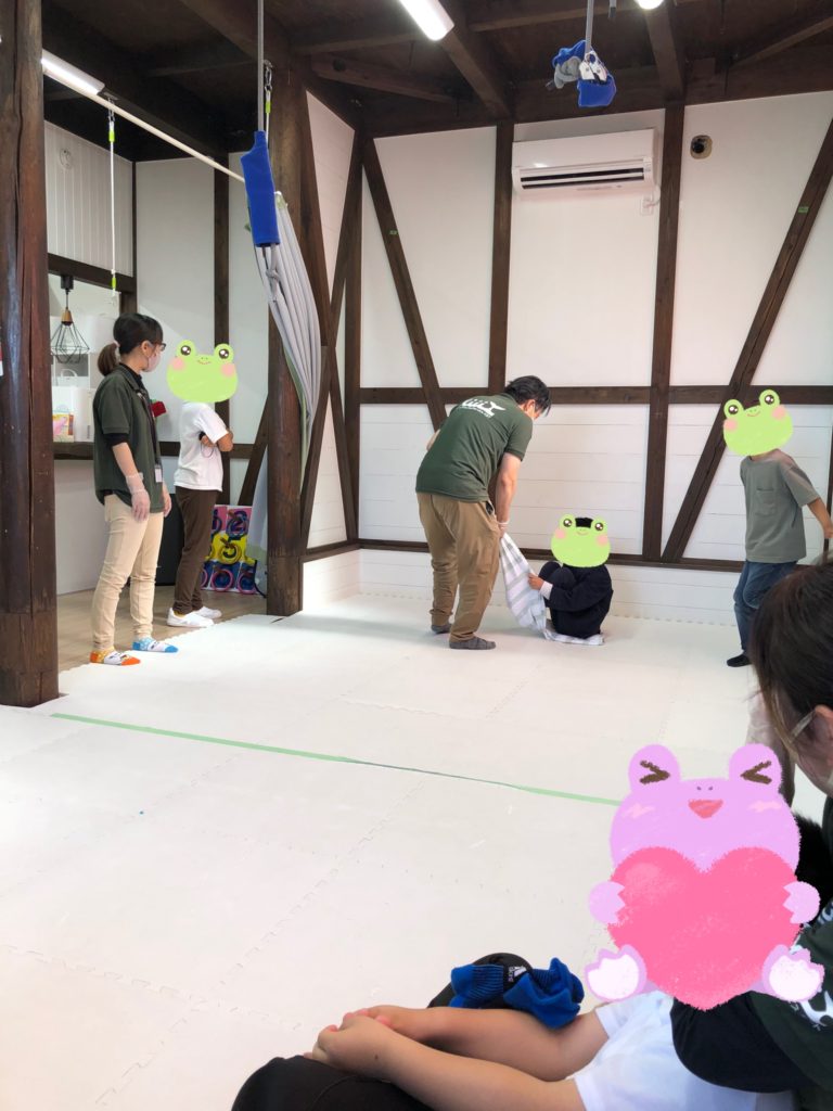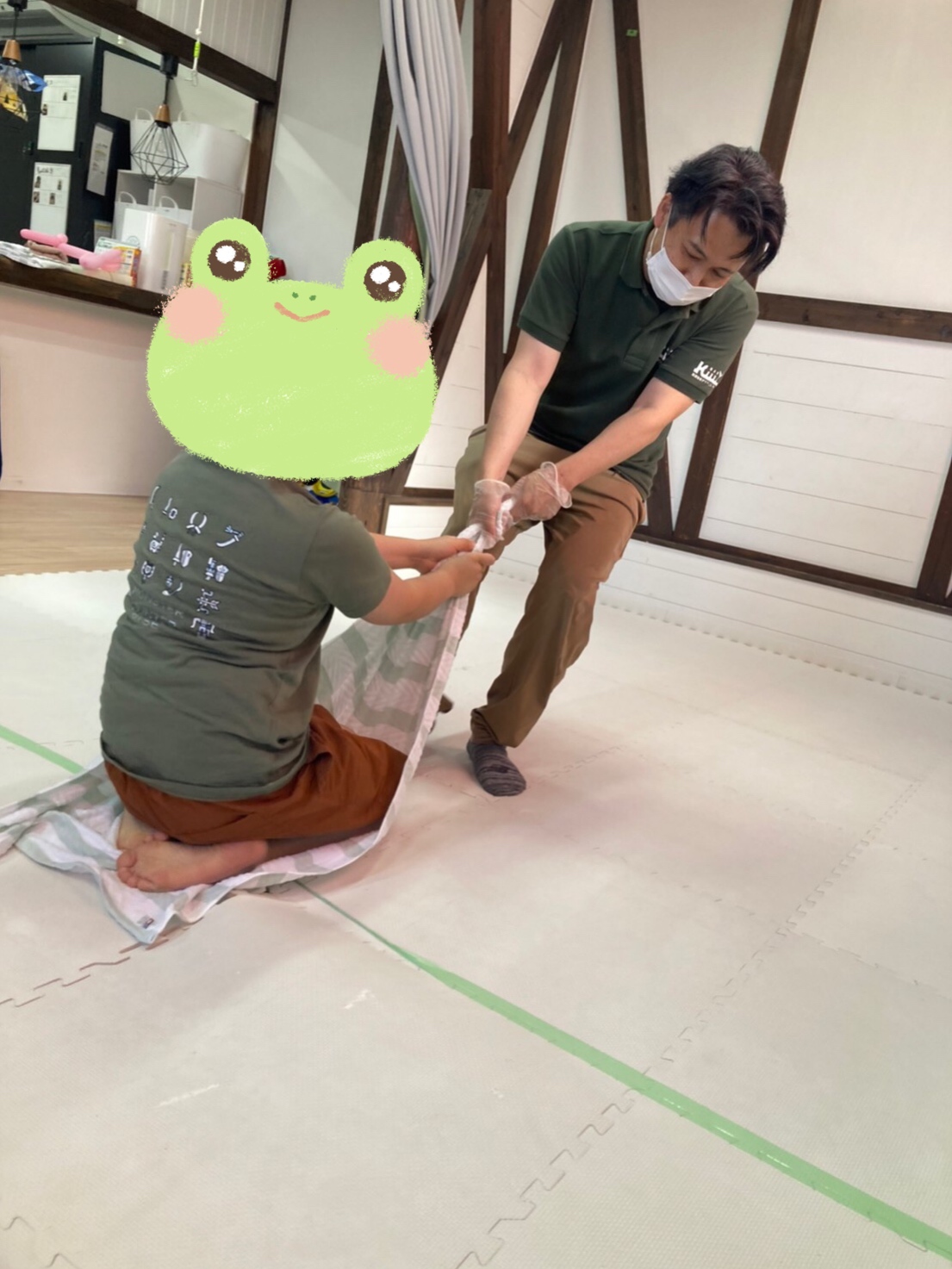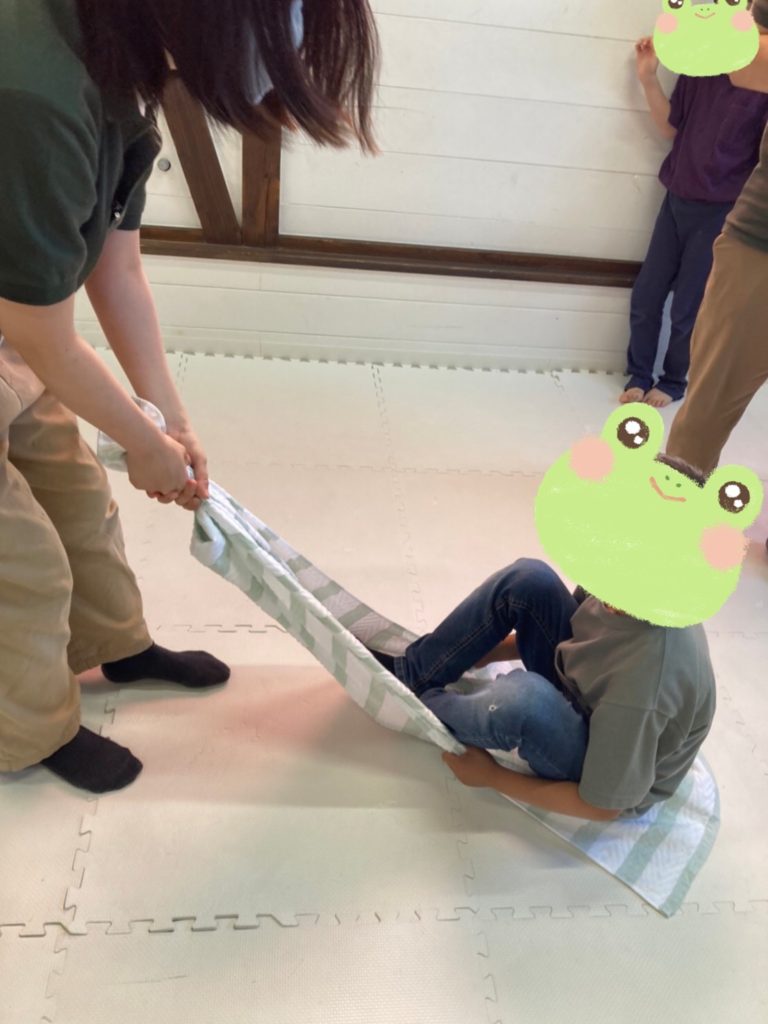 【松山南クラス】本日のできごと今日は魔法の絨毯みたいに、児童たちにタオルに乗ってもらって、職員がお運びしました^ – ^