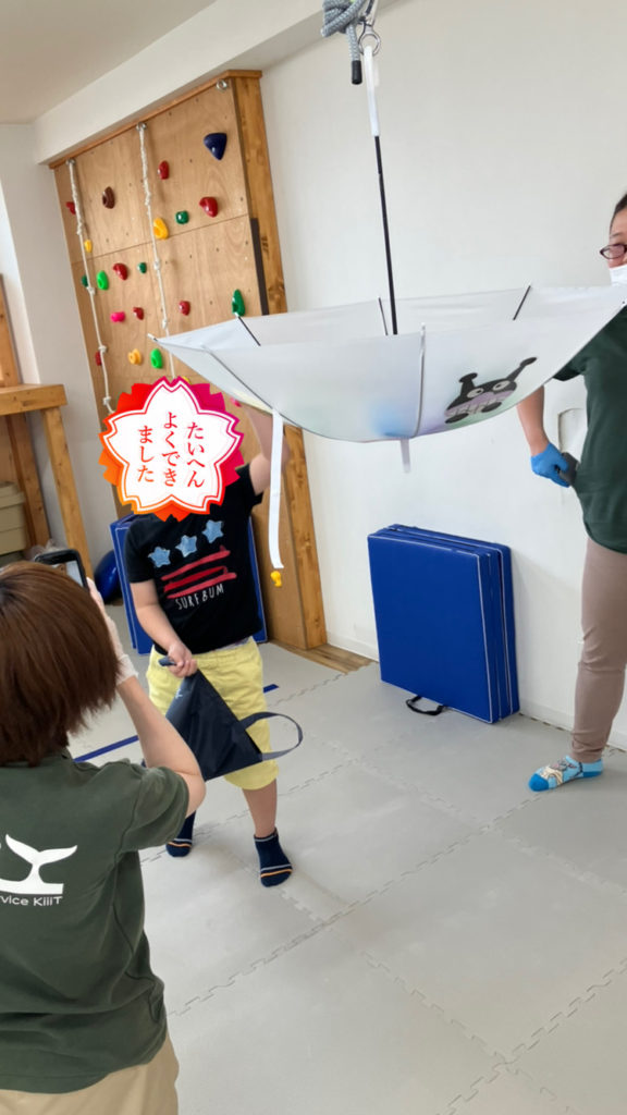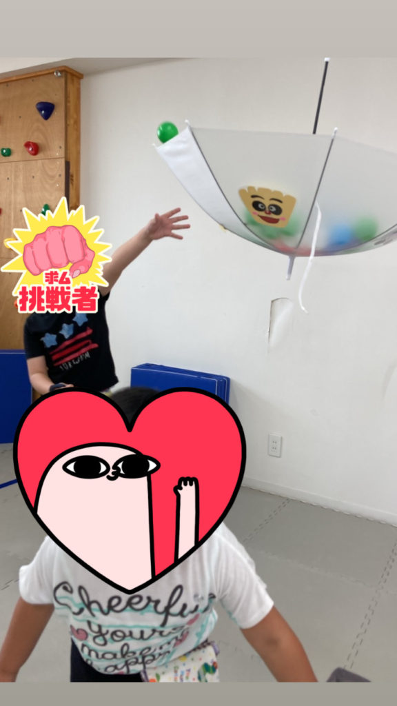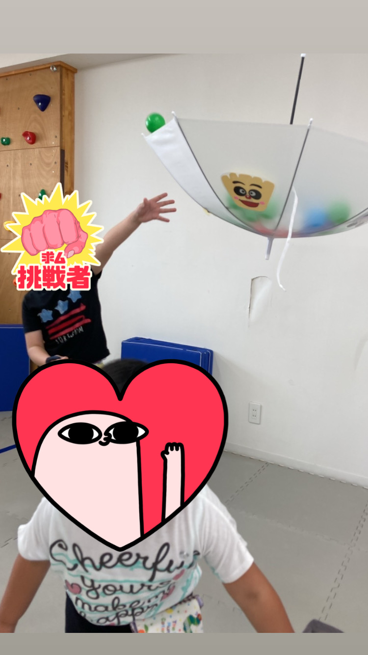 今日は集団活動として傘をカゴにして玉入れを行いました!傘を逆さにして上に吊ってカゴ代わりにしてそこにカラーボールを投げ入れます!