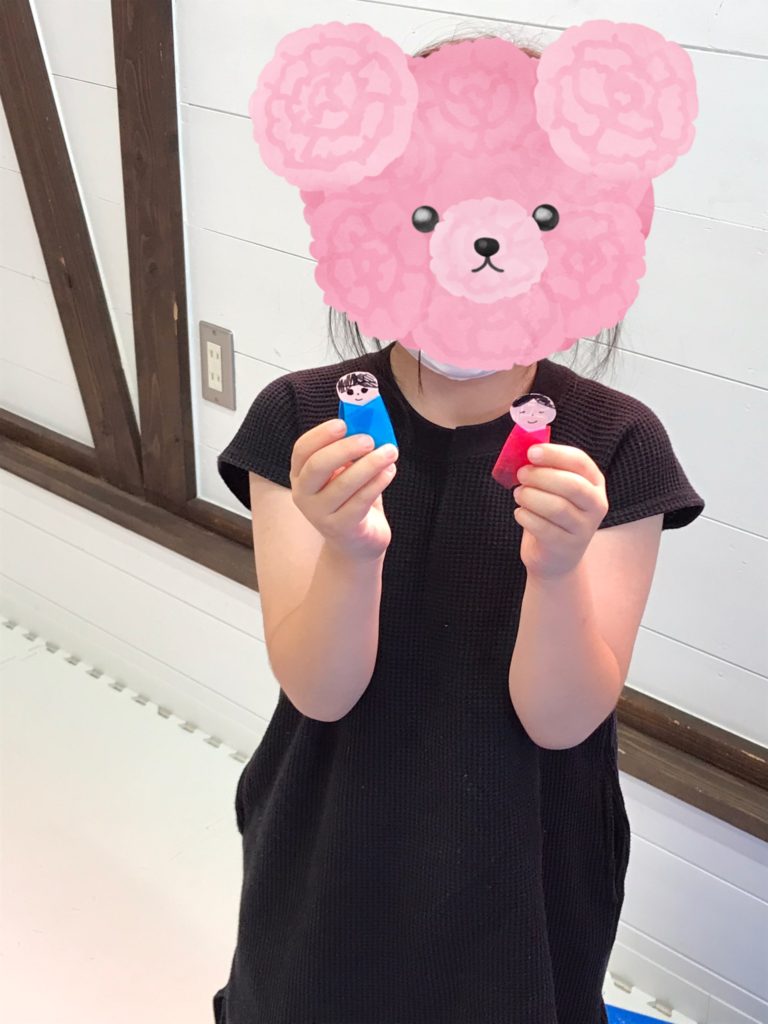 お顔はそれぞれペンやクレヨンで描いて、綺麗な着物は折り紙でペタペタと貼り合わせました。