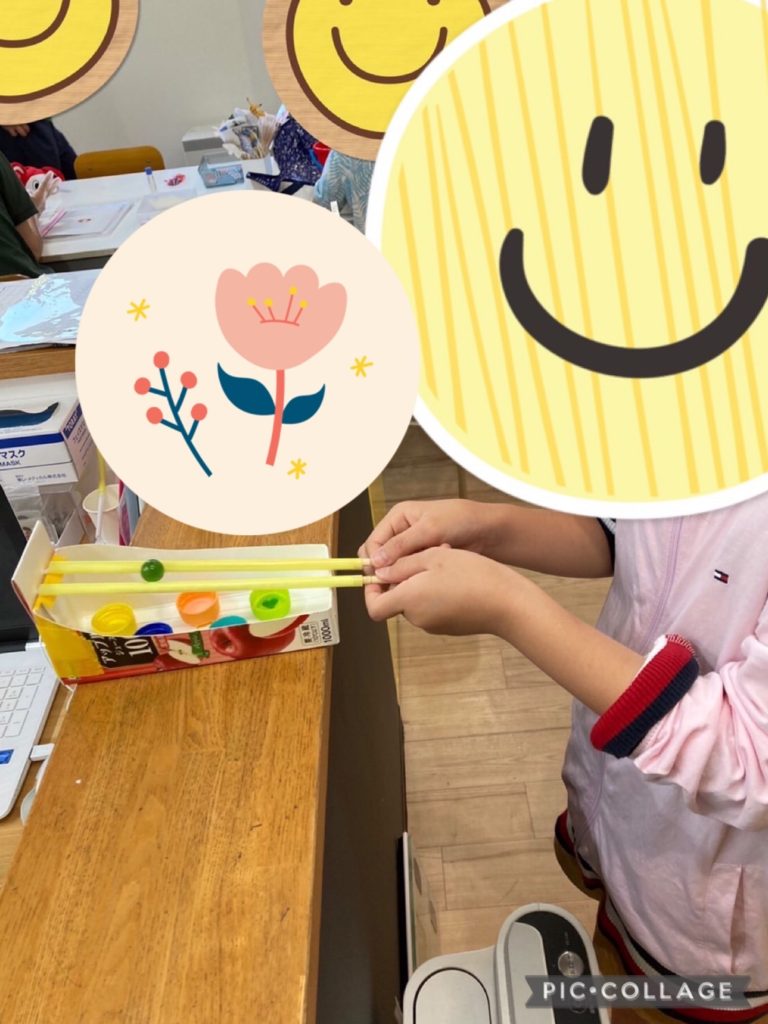 【今治北クラス】本日のできごとビー玉落としにチャレンジしました!割り箸とストローで作った操作棒を使ってコントロールをして、キャップの的を狙って落とします!操作棒の幅を調整しながらの方向とビー玉のコントロールが難しいですが、何度も挑戦して感覚を掴んでいきました!ビー玉のスピードを調整しつつ、集中をしてキャップの的を狙うことが出来ていました!