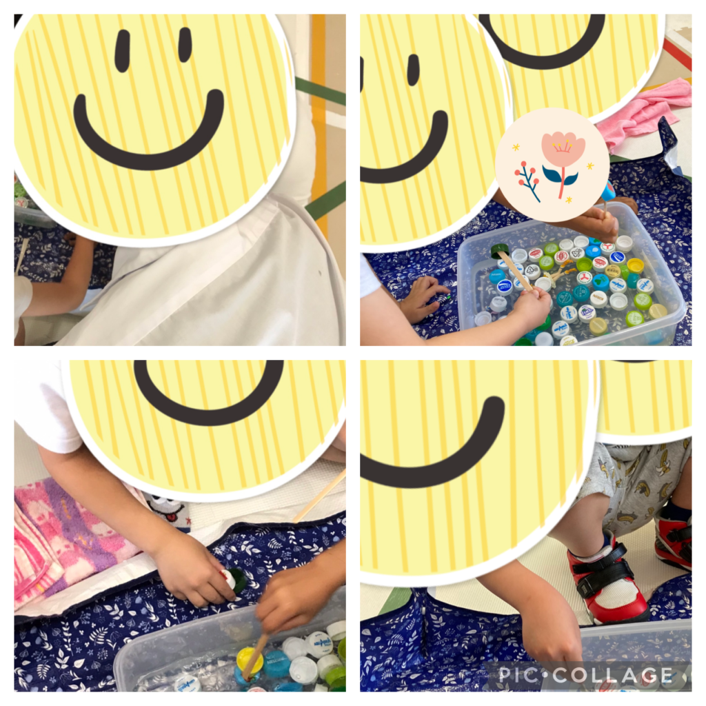 【今治北クラス】本日のできごと今日はみんなでペットボトルのキャップすくいゲームをしています♪