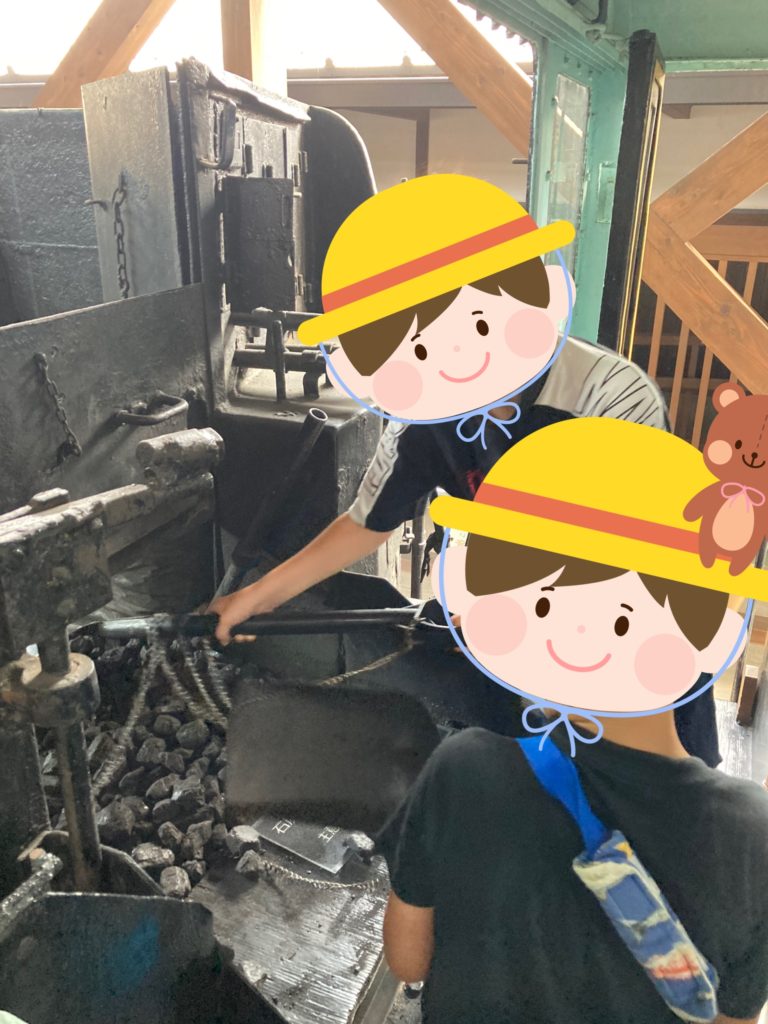 機関室に入って、石炭をスコップで「火室(かしつ)」に投げ入れて汗を流す『こども』もいました。