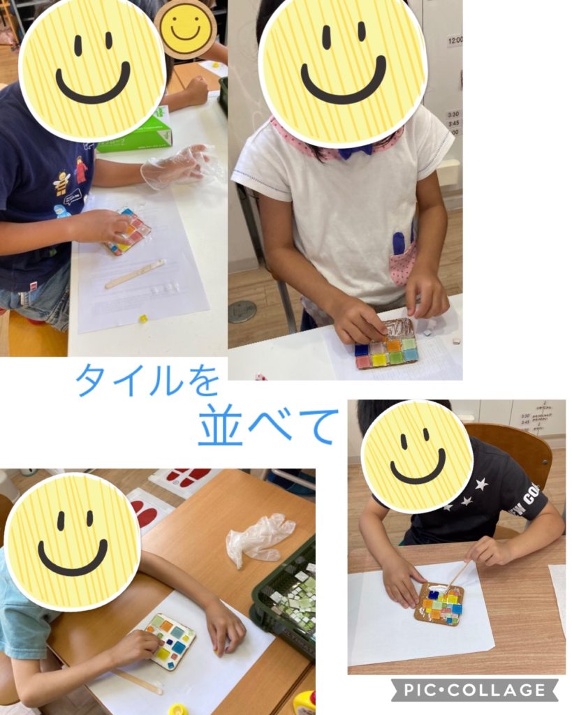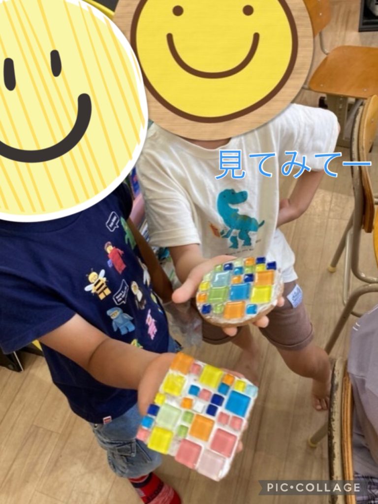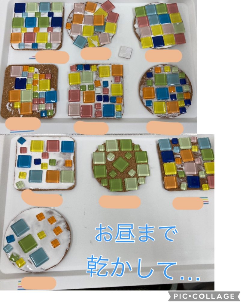 今日はみんなでタイルコースターを作りました。途中乾かす必要があるので、午前と午後の2回に分けて行いました✨