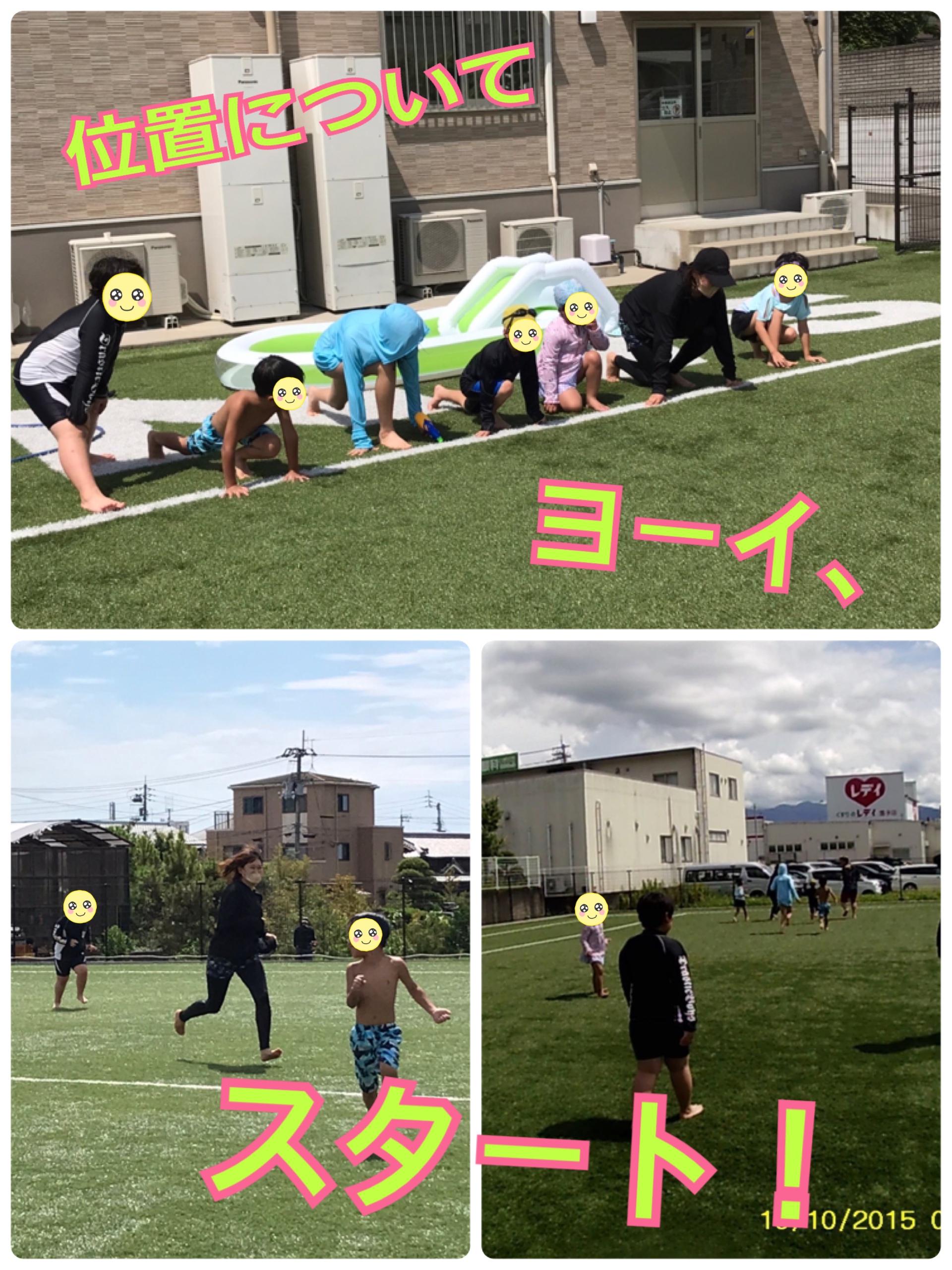 ビニールプールに水を溜めている間は広い芝生を使って競争です😆