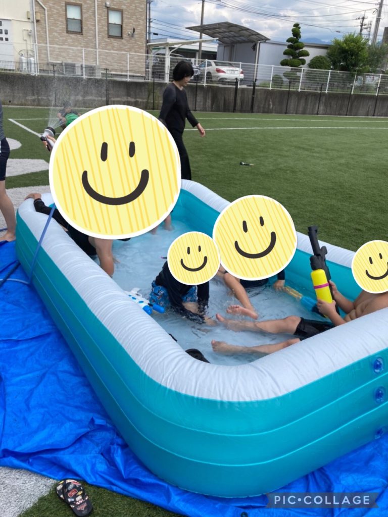 1時間半、キート松山南クラスの児童と職員が貸し切りで、思う存分、プールや水鉄砲で遊びました。