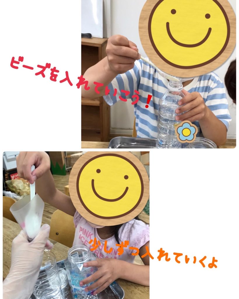膨らませた風船をペットボトルにつけて、ビーズを入れていき…