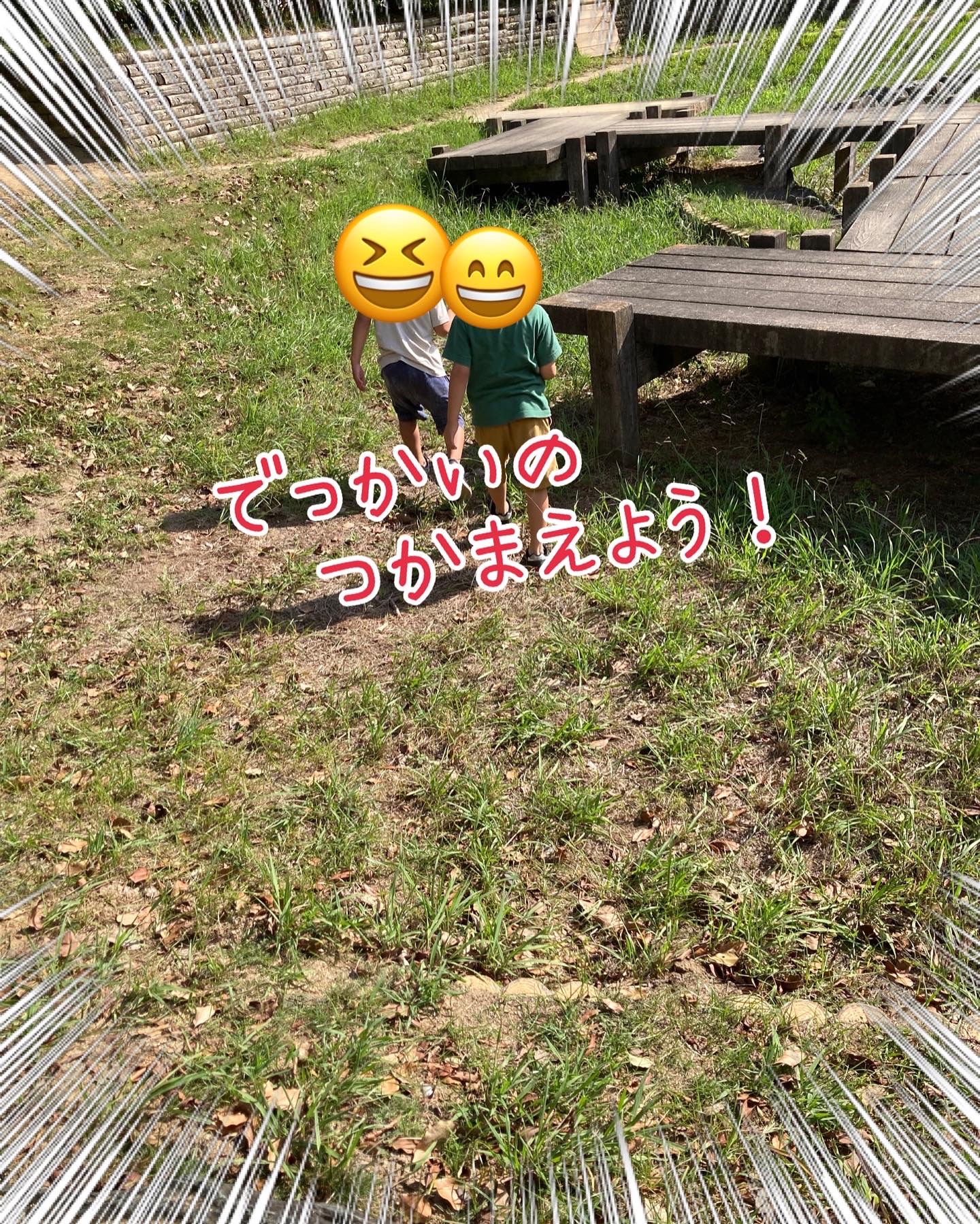 公園内には芝生や草の生えている場所がありました。足を踏み入れましたら、ピョー〜ンと飛ぶものが🦗🦗いちどに3匹ほどの大小のバッタが飛んでいます。緑色だけでなく、グレーのようなものや真っ黒のコオロギもいます。